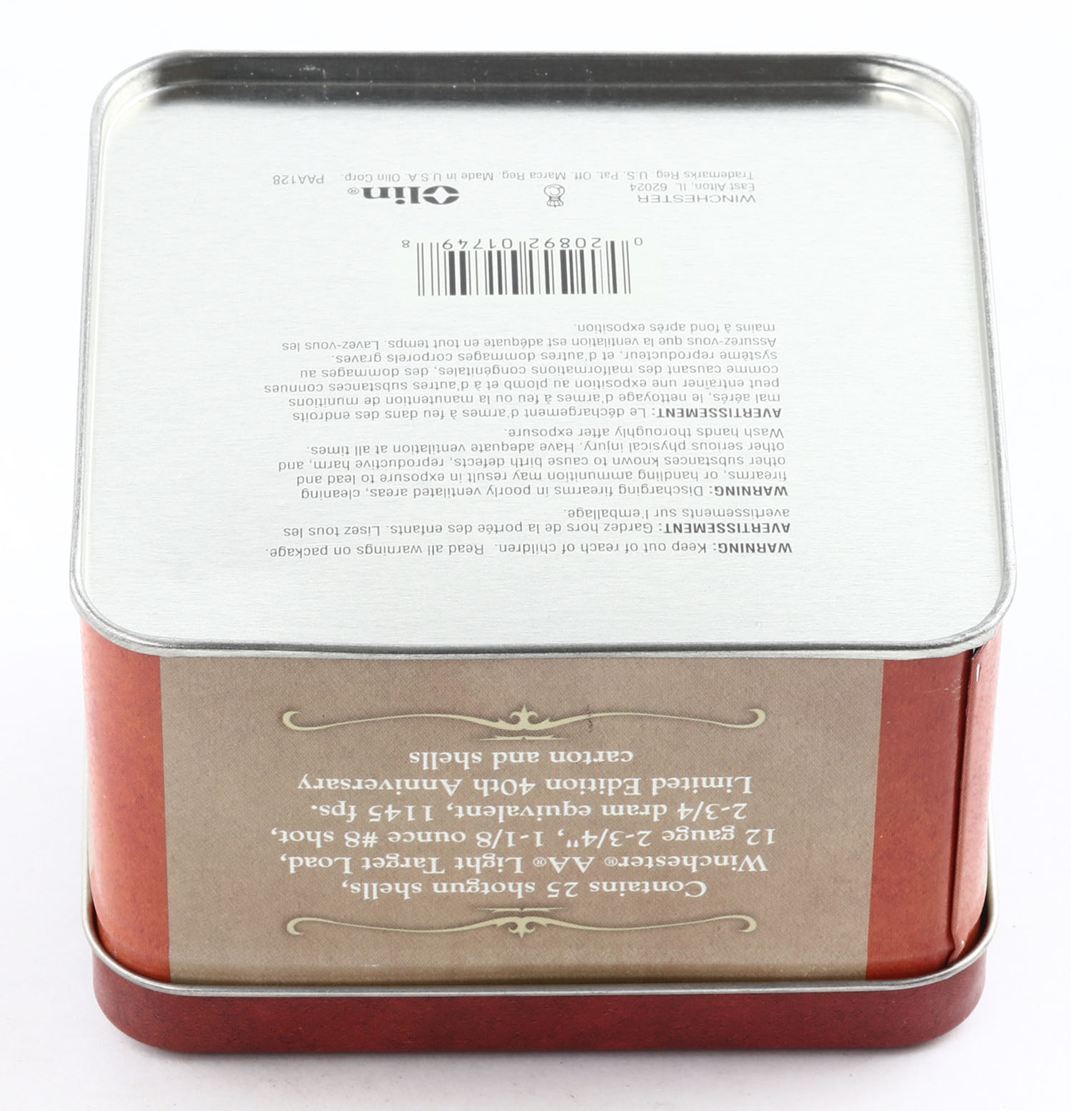 Winchester, AA Light Target Load, 12ga, 1pc., Full, shot size 8, box comes in a metal tin case, box and case are minty, plastic shells are mint. Grade: MINT - Value: 20 to 60