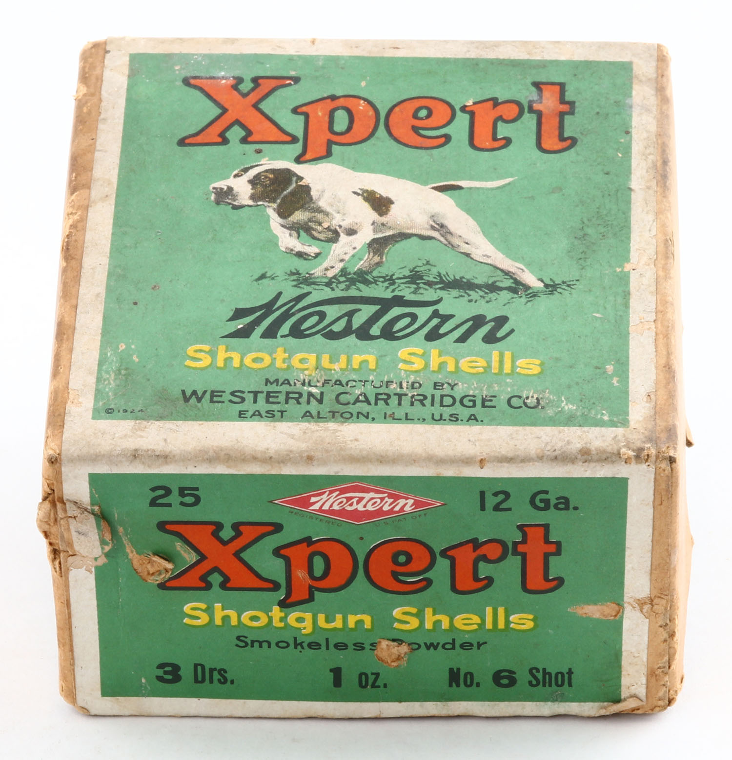 Western, Xpert, 12ga., 2pc., Empty, shot size 6, 3 Drs. 1 Oz., buff box with green, red & black label, box shows dog on point, box has scuffing with light age soiling & edge wear, label has a partial tear to side, Western Diamond Logo on one side. Grade: Very Good + - Value: 300 to 600