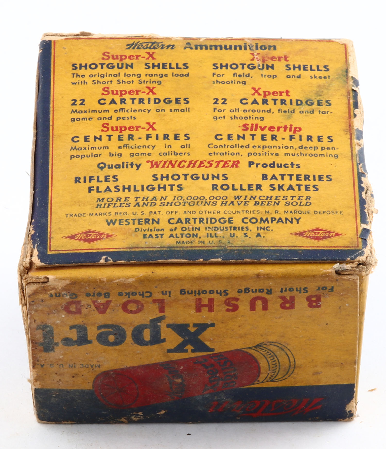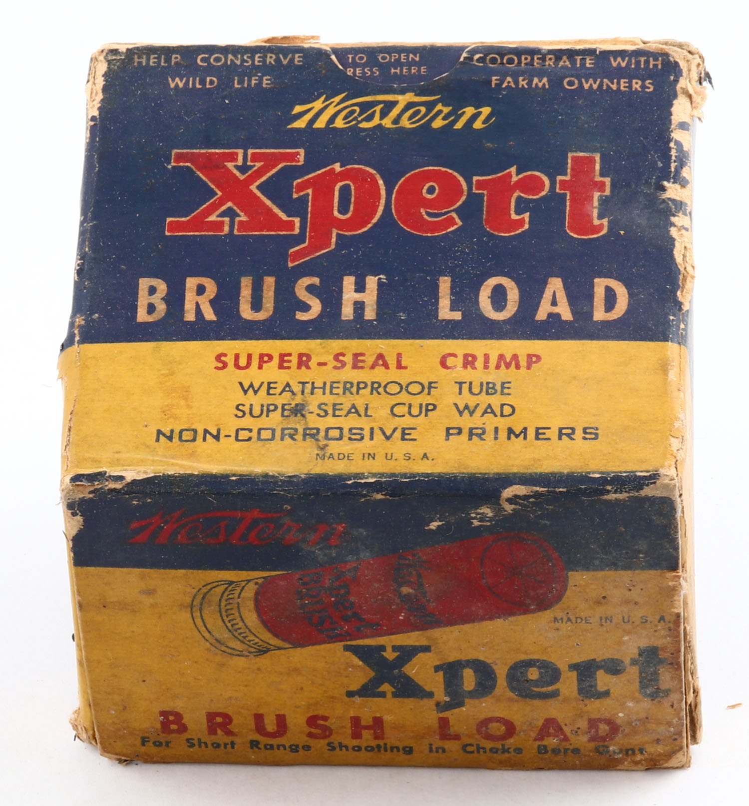Western, Xpert, Brush Load, 20ga., 1pc., Full, shot size 8, 2 3/4'', multi-colored box, box has age soiling with edge wear & scuffing, paper shells are excellent. Grade: Good ++ - Value: 10 to 40