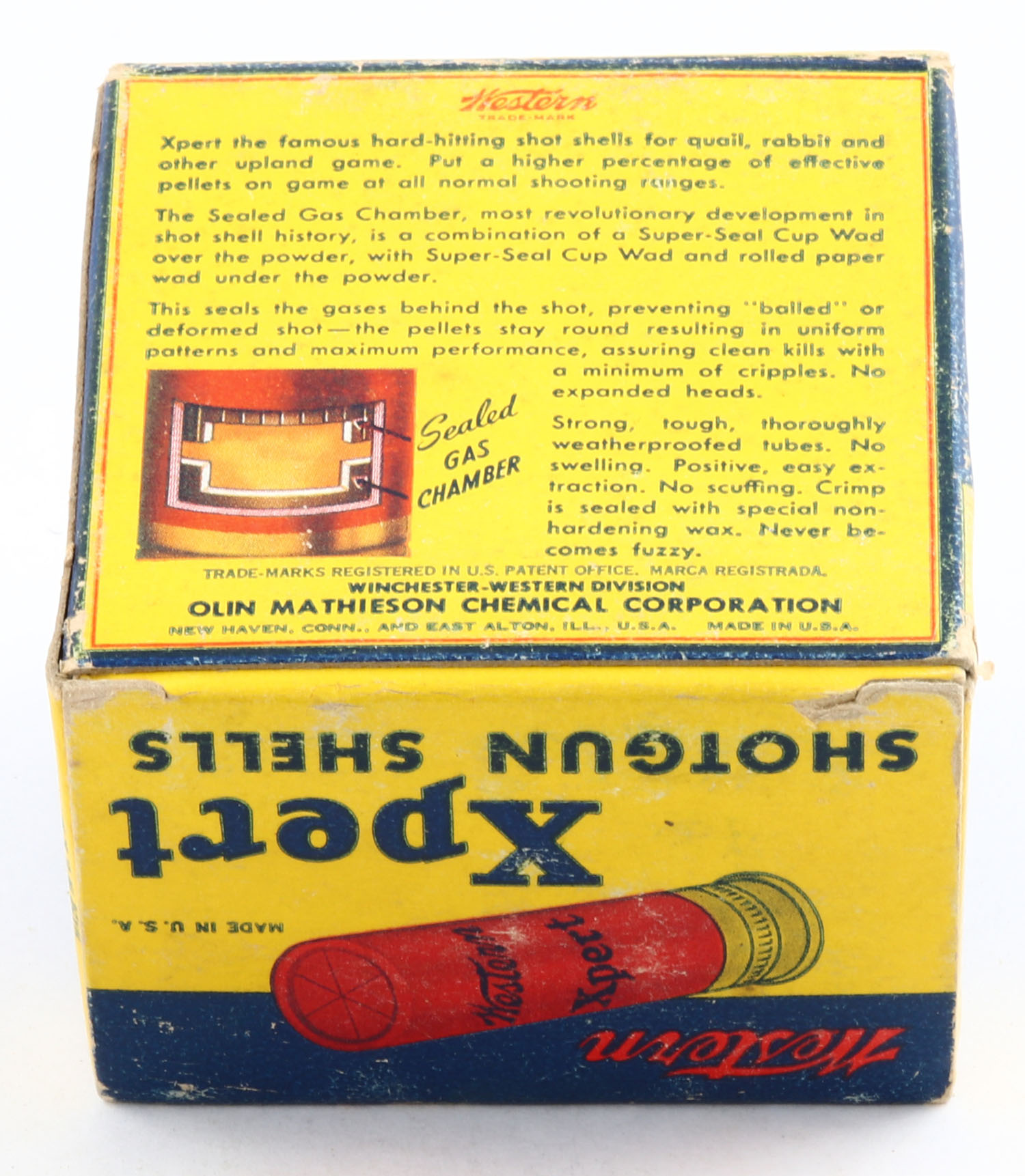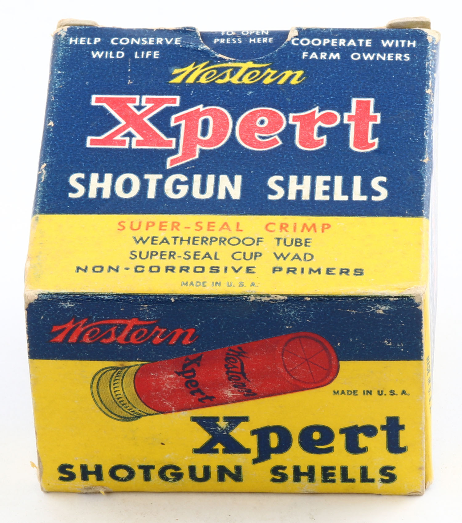 Western, Xpert, 20ga., 2 3/4'', 1pc., Full, shot size 8, multi-colored box, box has scuffing with some edge wear, paper shells are excellent. Grade: Very Good ++ - Value: 10 to 30