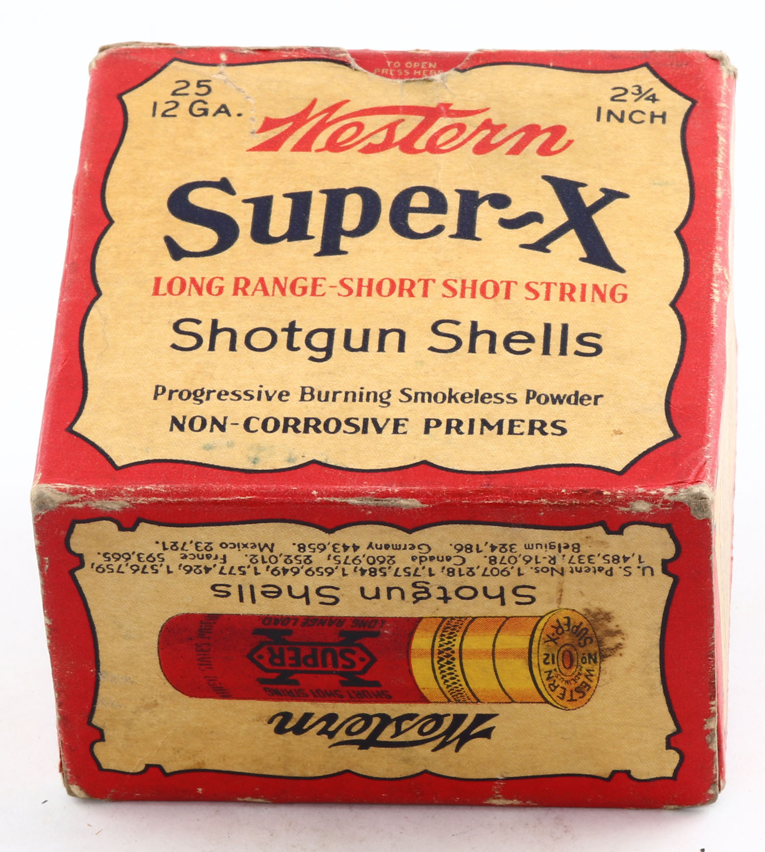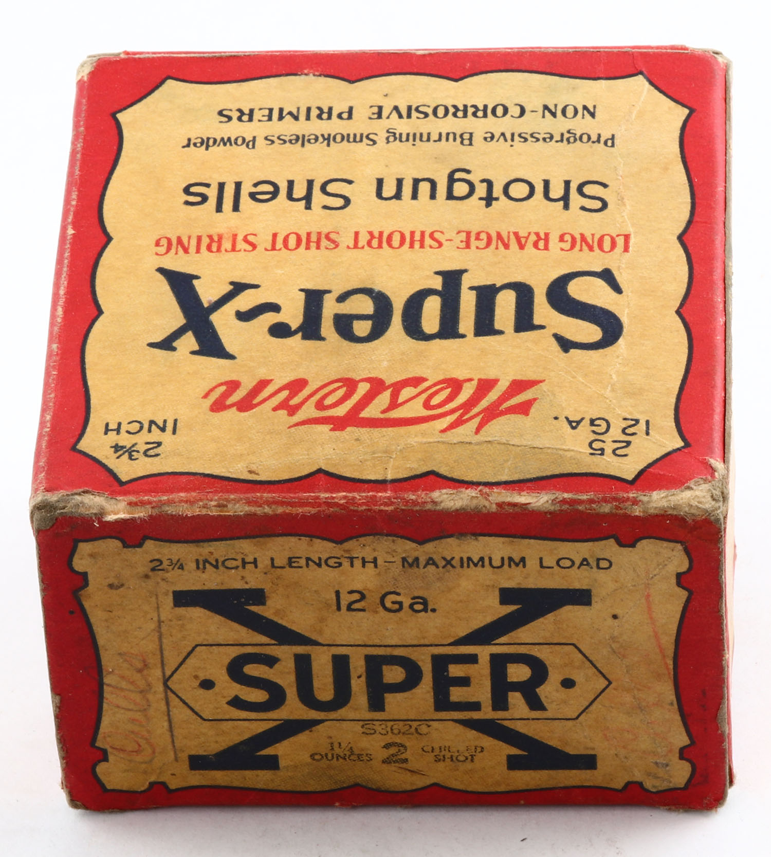 Western, Super X, 12ga., 1pc., Full with 23rds. Being correct shot size, 2 3/4'', shot size 2 Chilled Shot, box is solid with light edge wear & some age soiling with great colors, paper shells are excellent. Grade: Very Good ++ - Value: 20 to 60