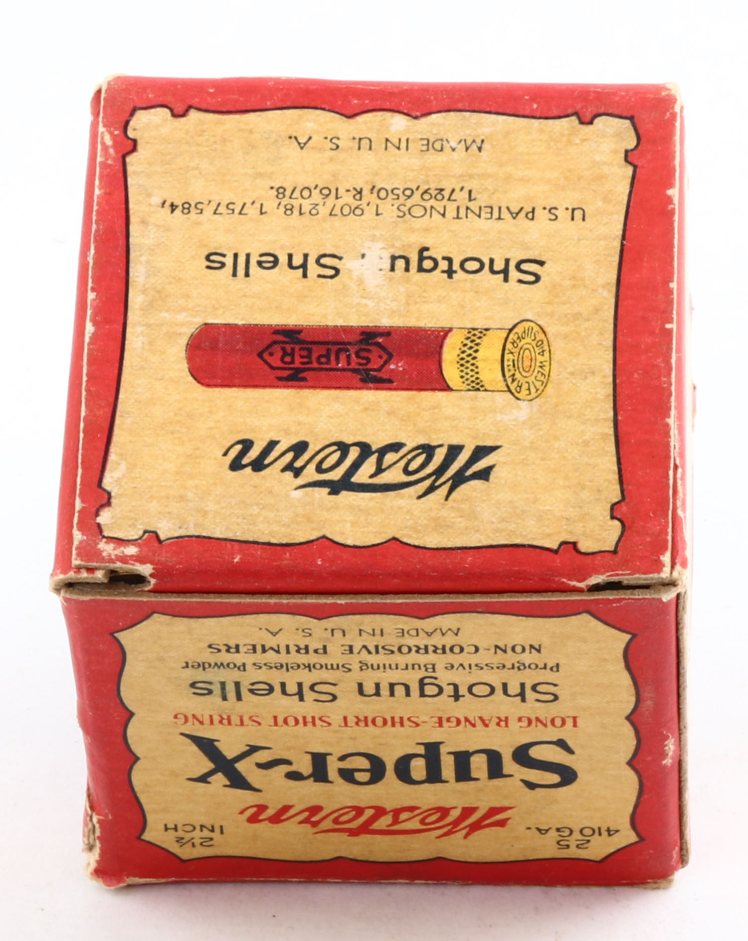 Western, Super X, 410ga., 2 1/2'', 1pc., Full, 7 1/2 Chilled Shot, red, buff & black box, box has a partial seam split to inside flap, has edge wear & some scuffing with nice colors, paper shells are very good. Grade: Very Good ++ - Value: 40 to 80