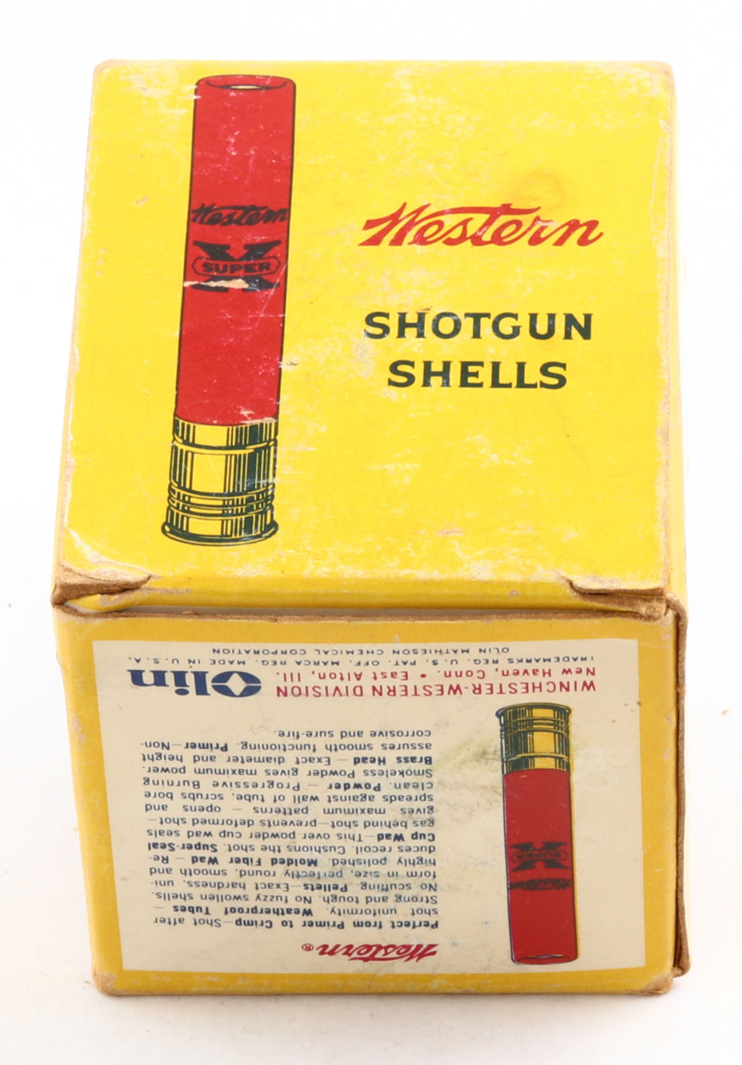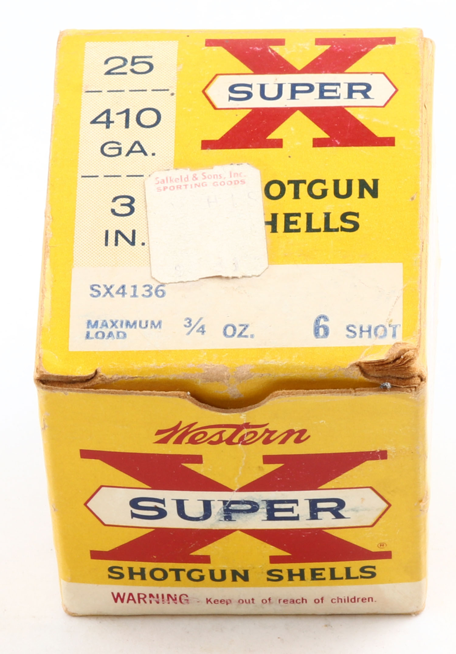 Western, Super X, 410ga., 1pc., Full, shot size 6, 3'', multi-colored box, box is solid with light age soiling & very nice color, paper shells are excellent. Grade: Very Good ++ - Value: 10 to 40