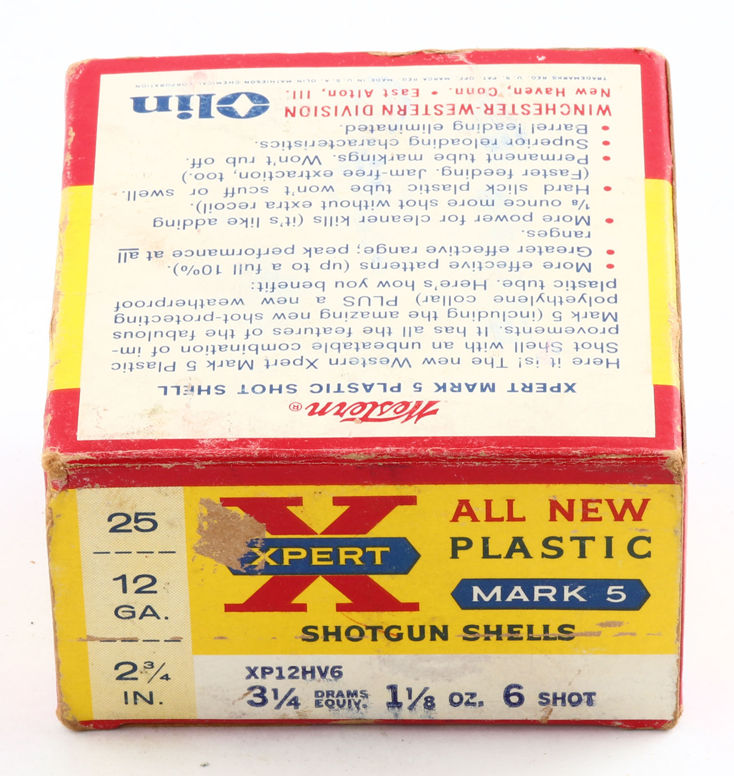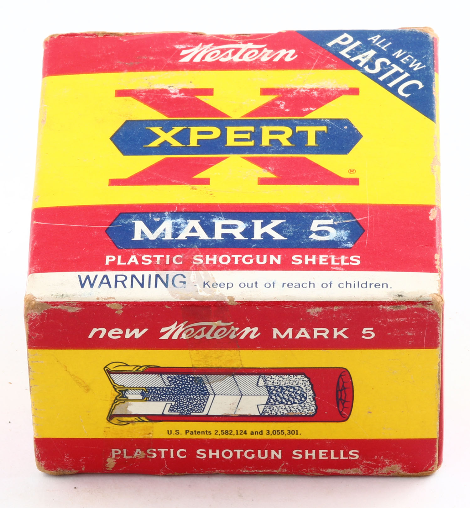 Western, Super-X Mark 5, 12ga., 2 3/4'', 1pc., Full, shot size 6, multi-colored box, box has some scuffing, plastic shells are excellent. Grade: Very Good + - Value: 10 to 30