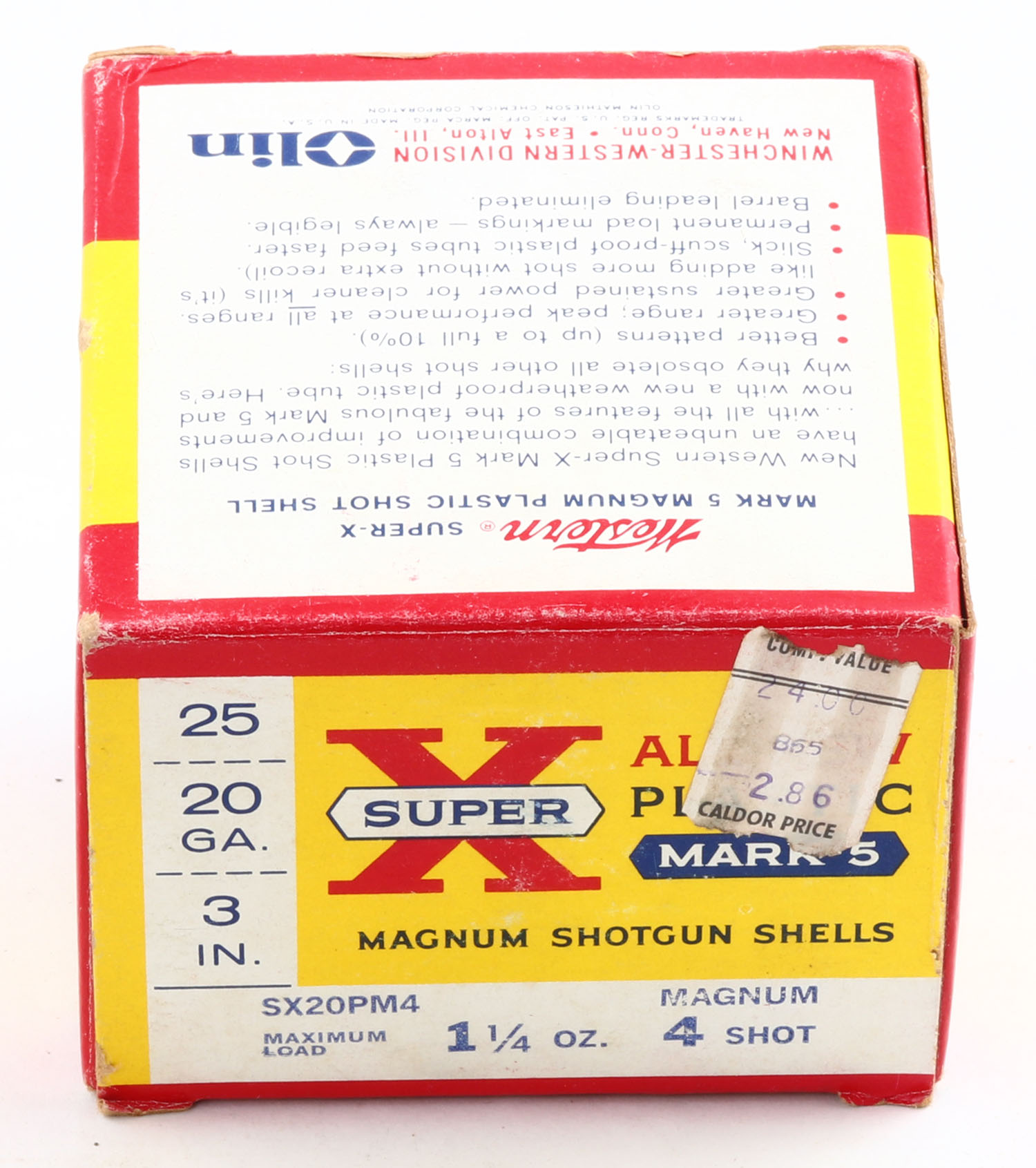 Western, Super X, Mark 5, 20ga., 3'', 1pc., Full, shot size 4 Magnum, multi-colored box, box is solid with light scuffing, plastic shells are excellent. Grade: Very Good ++ - Value: 10 to 30