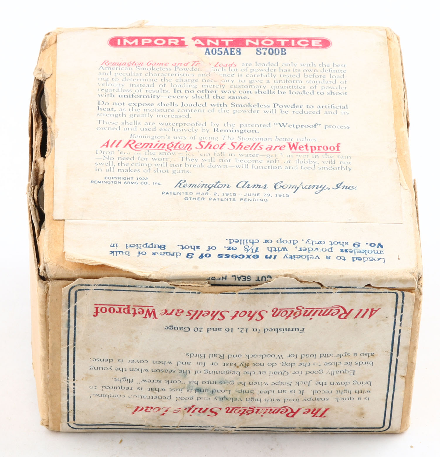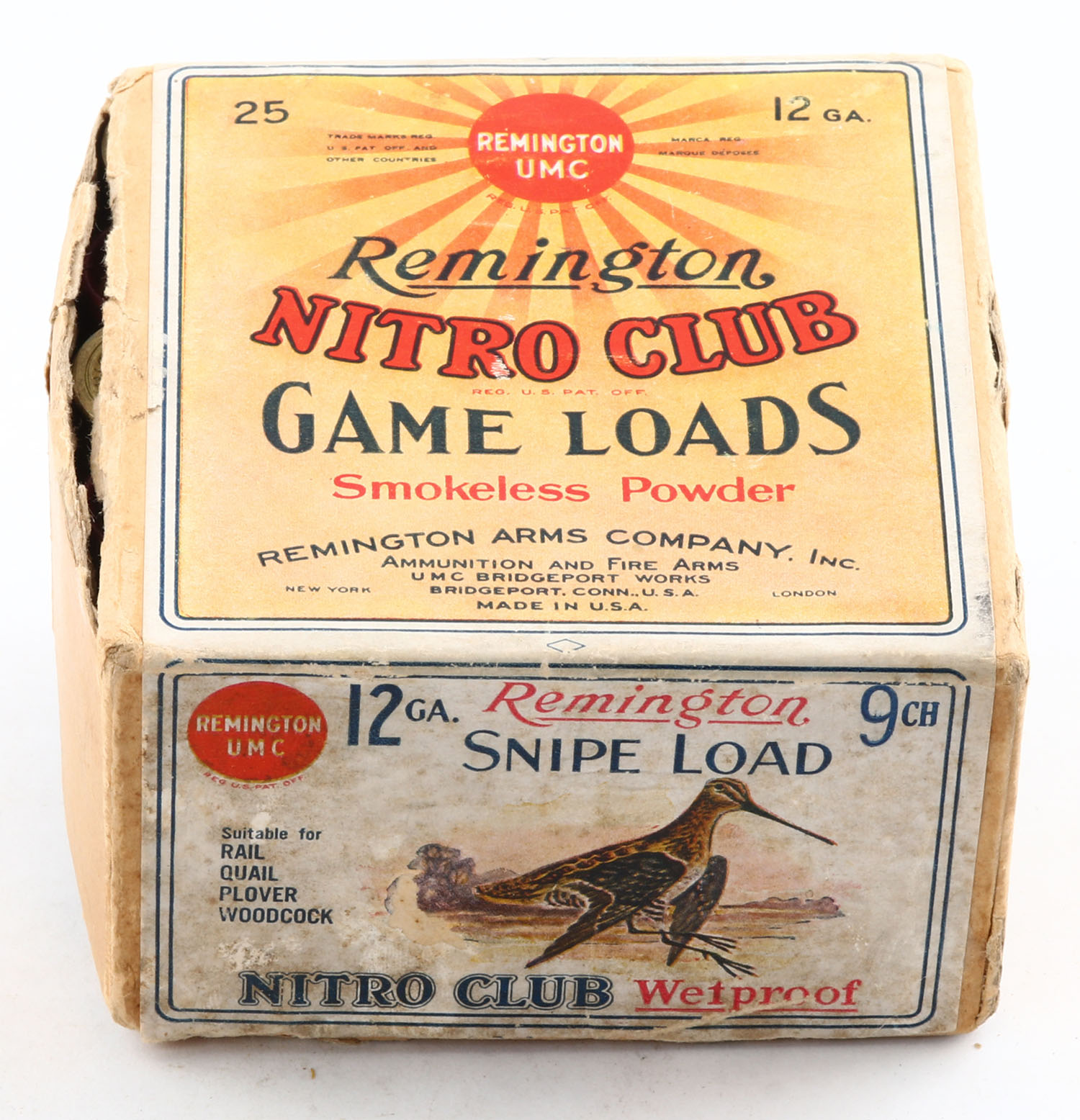Remington UMC Nitro Clubs, GAME LOADS, SNIPE LOAD, 12ga., 2pc., FULL, shot size 9 CH, buff box with sunburst logo & SNIPE on side, box has seam splits with edge wear, has some age soiling, label is excellent with great color, paper shells are excellent. Grade: Very Good + - Value: 200 to 800