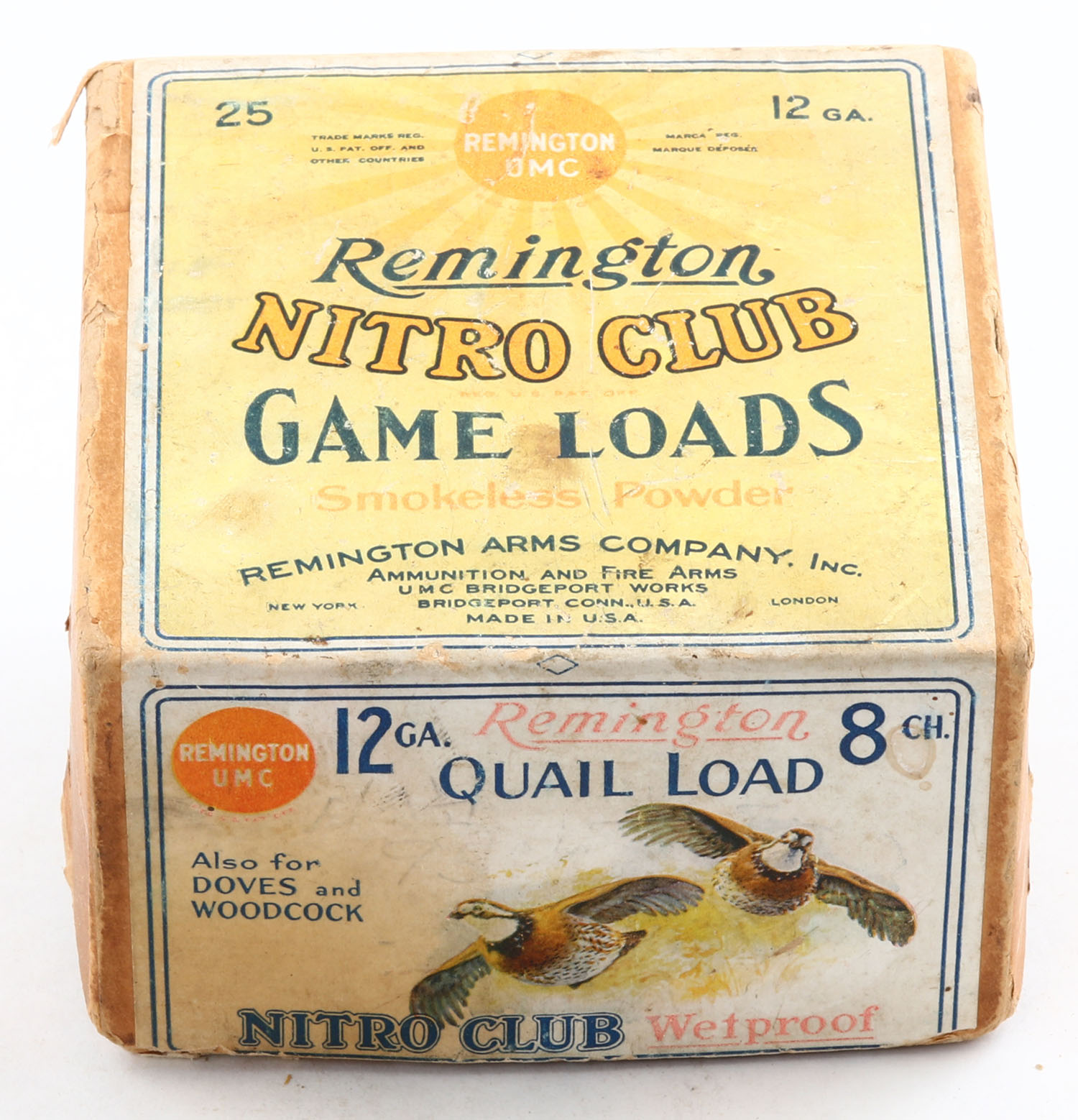 Remington UMC Nitro Club, GAME LOADS, QUAIL LOAD, 12ga., 2pc., Empty, shot size 8 CH, buff box with sunburst logo & QUAIL in flight on side, box has age soiling & edge wear with a minor tear to right side . Grade: Good ++ - Value: 100 to 400
