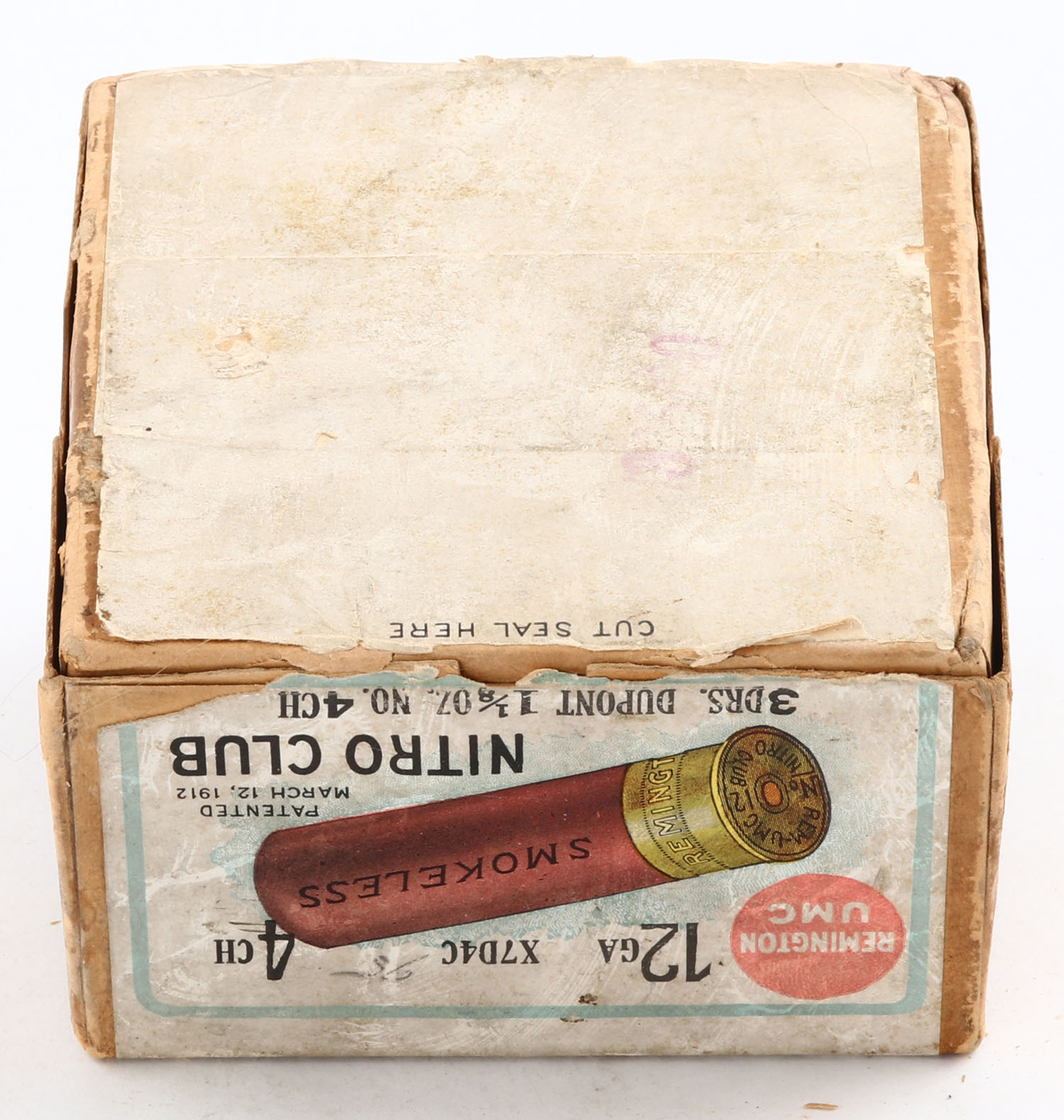 REM U.M.C. Nitro Club, 12 ga, 2pc., Full, shot size 4CH, buff box with sunburst logo & Mallard flying on top, box has a seam split and age soiling, has edge & corner wear, paper shells are excellent. Grade: Very Good + - Value: 40 to 200