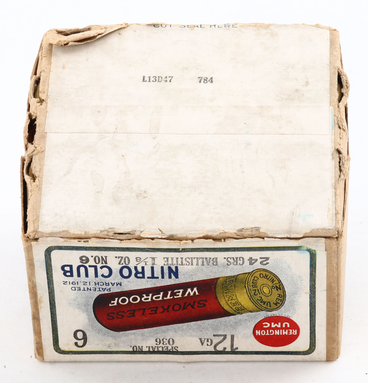 Remington UMC, Nitro Club, 12ga., 2pc., Full, shot size 6, buff box with sunburst logo & Mallard flying on top, box has shell protrusions with light age soiling, has some edge wear & light scuffing to bottom, paper shells are excellent. Grade: Very Good - Value: 40 to 200