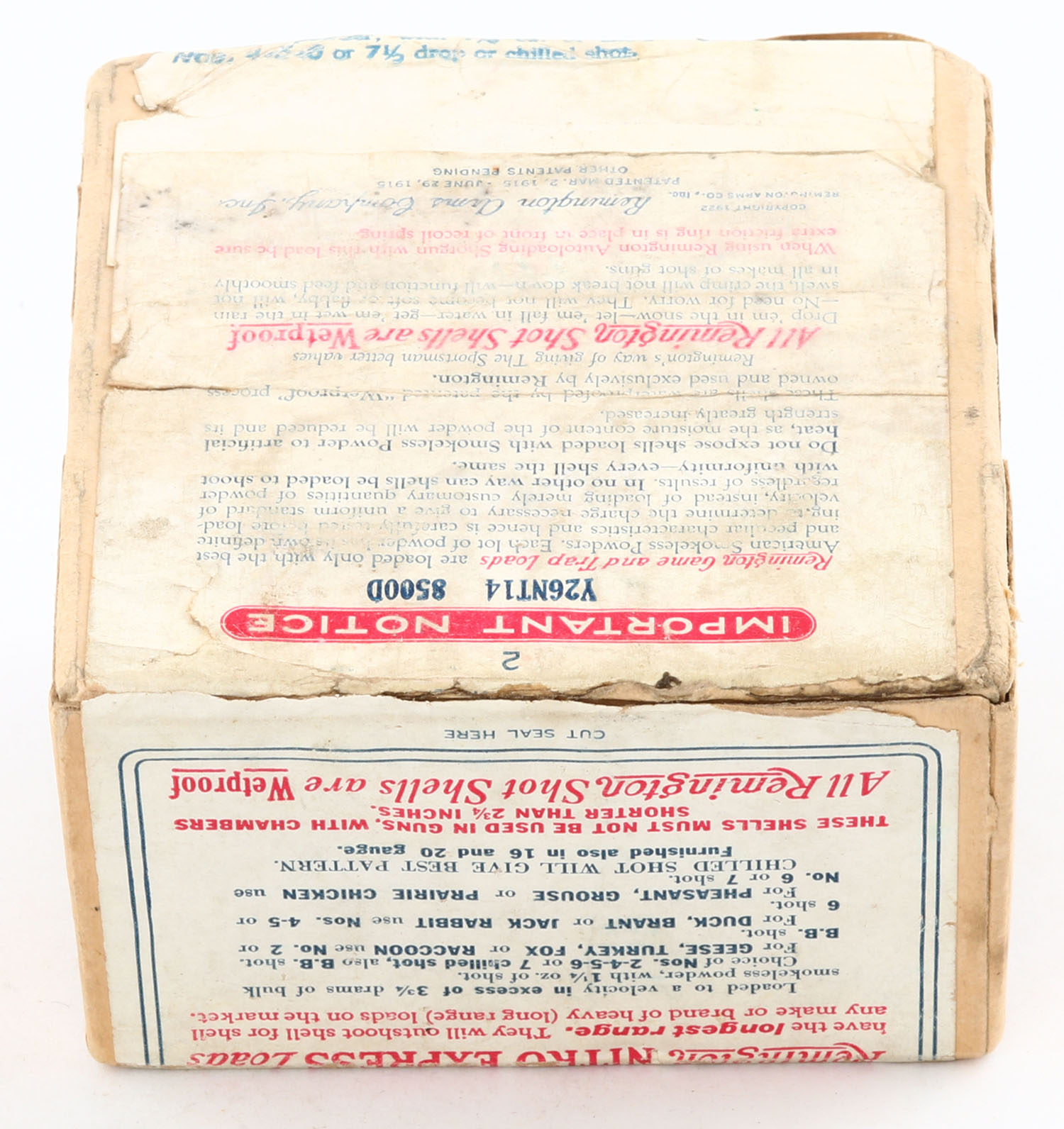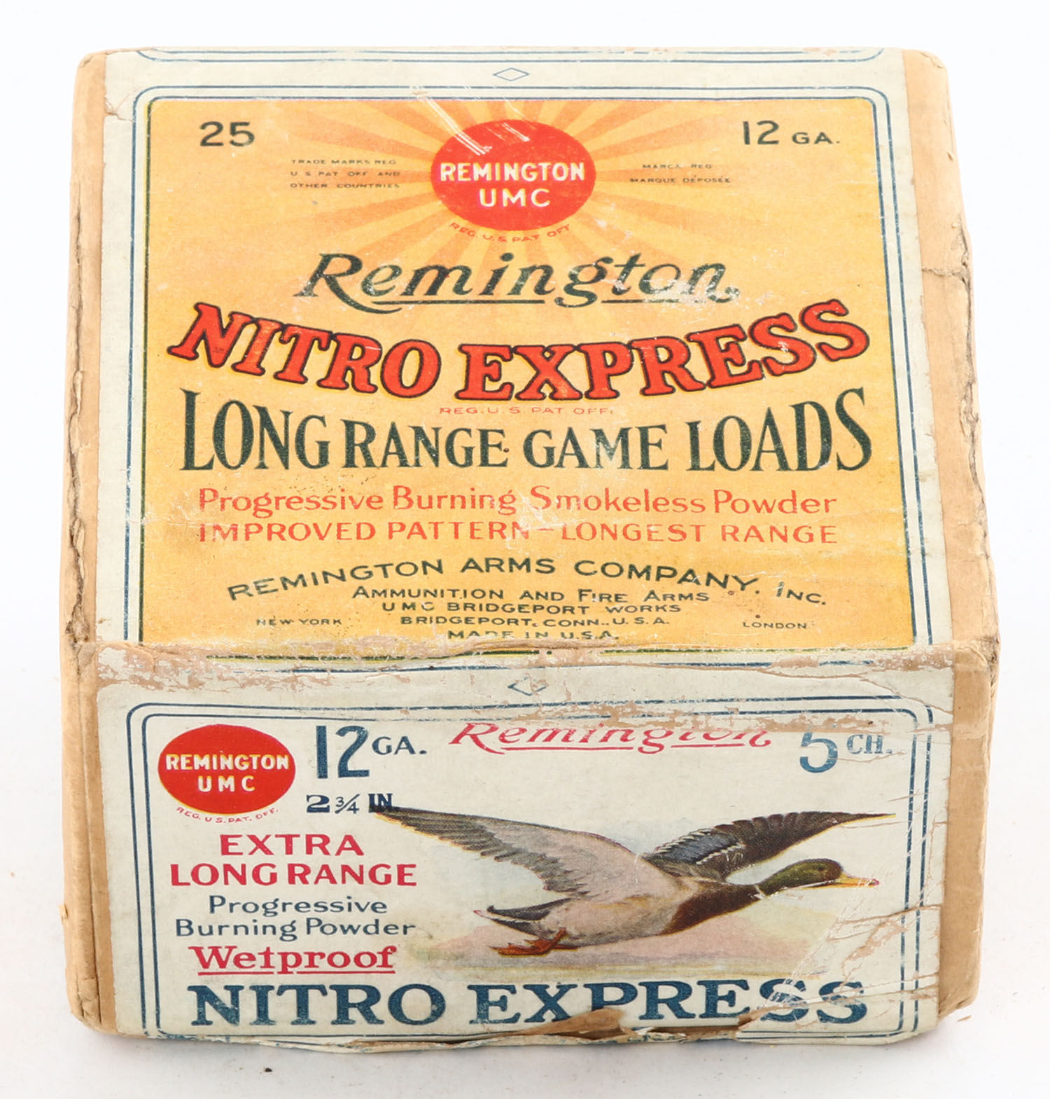 Remington Nitro Express Long Range GAME LOADS, Flying Mallard, 12ga., 2pc., Empty, shot size 5 CH, buff box with sunburst logo, box has edge wear with scuffing, has a tape repair to seam split on inside. Grade: Good ++ - Value: 20 to 80
