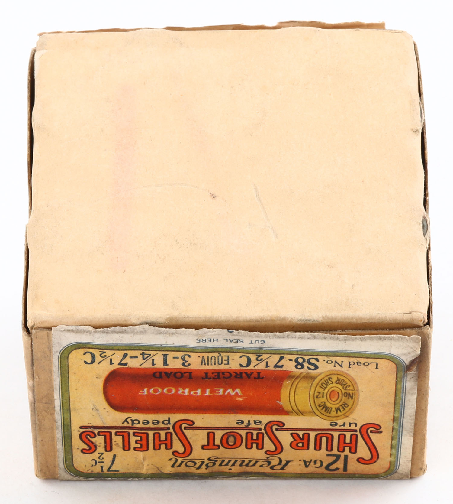 Remington UMC, Shur Shot Shells, 12ga., 2pc., Full, shot size 7 1/2 C, buff box with cream, green, white & orange paper label, box has age soiling with scuffing, bottom is missing label, paper shells are good. Grade: Very Good - Value: 40 to 200