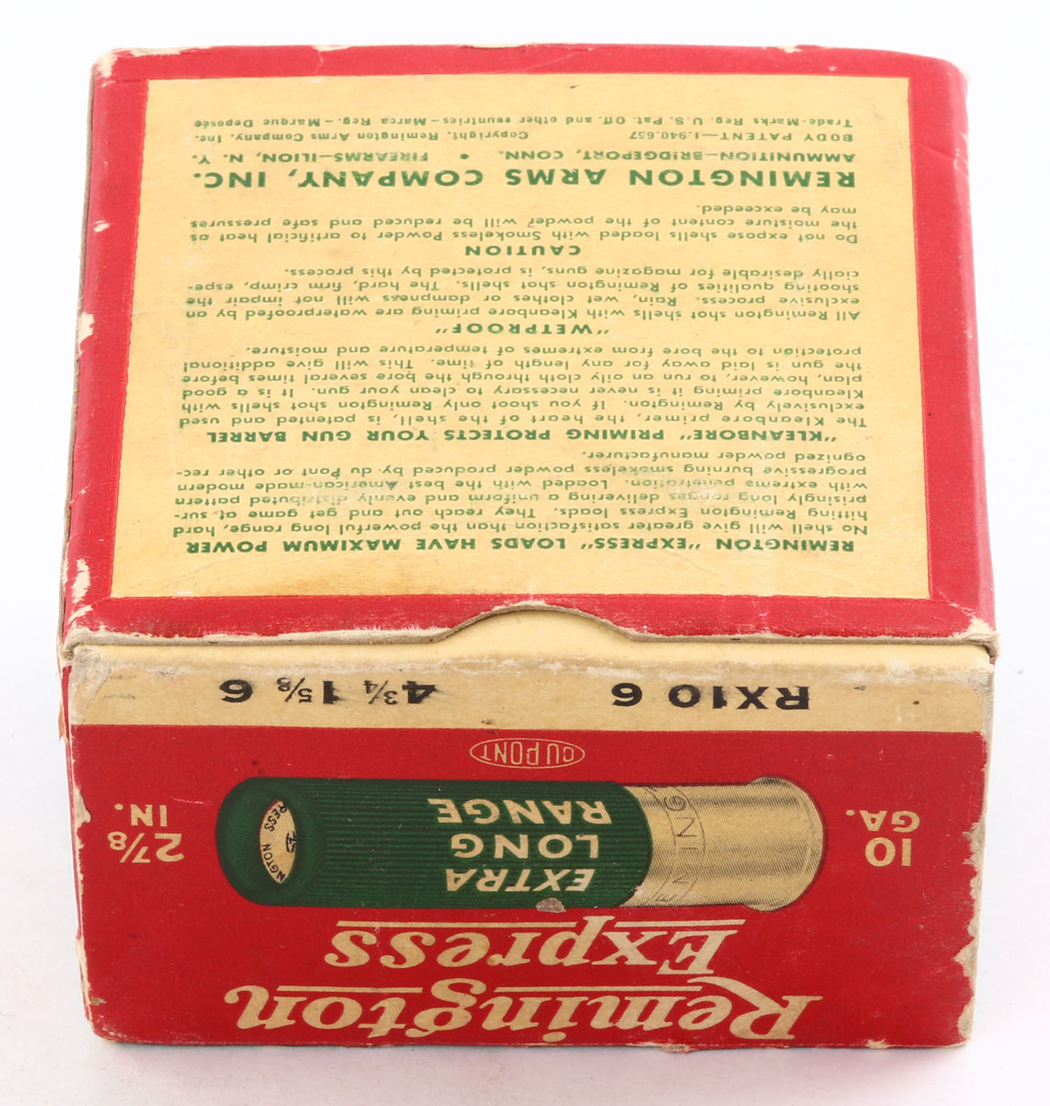 Remington, Express Extra Long Range, 10ga., 1pc., Full, shot size 6, red and green box, 2 7/8'', box is solid with edge wear, paper shells are excellent. Grade: Excellent - Value: 40 to 100