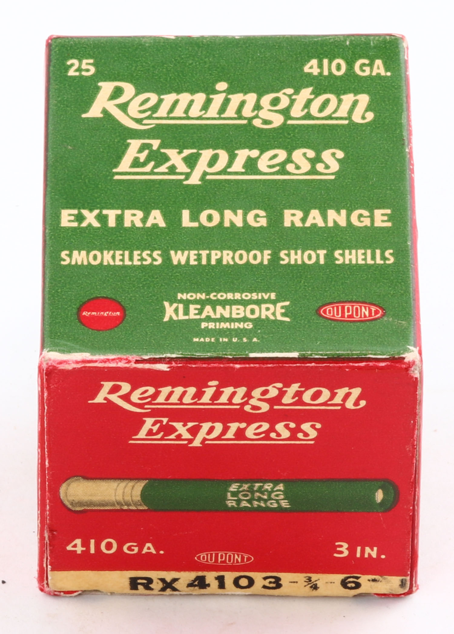 Remington Express, Extra Long Range, 410ga., 3'', 1pc., Full, shot size 6, box is white, yellow, red and green, box is very solid with excellent colors, paper shells are excellent. Grade: Excellent ++ - Value: 20 to 50