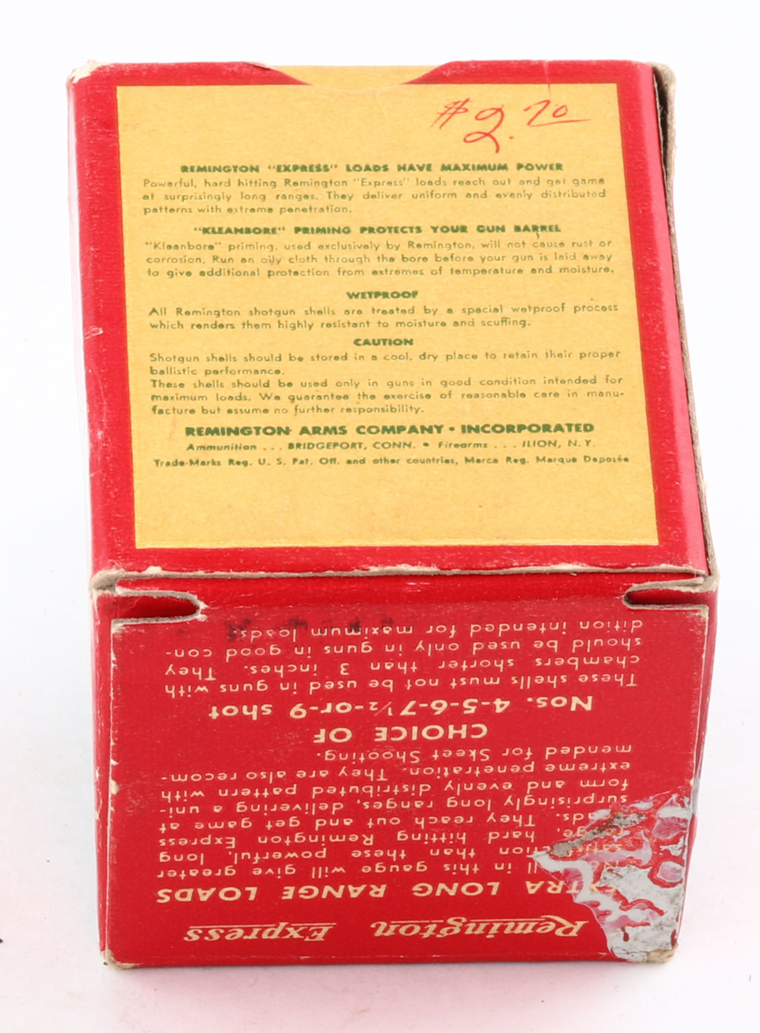Remington Express, Extra Long Range, 410ga., 3'', 1pc., Partial 22rds, shot size 7 1/2, box is white, yellow, red and green, box has light corner wear with nice colors, paper shells are excellent. Grade: Excellent - Value: 20 to 50