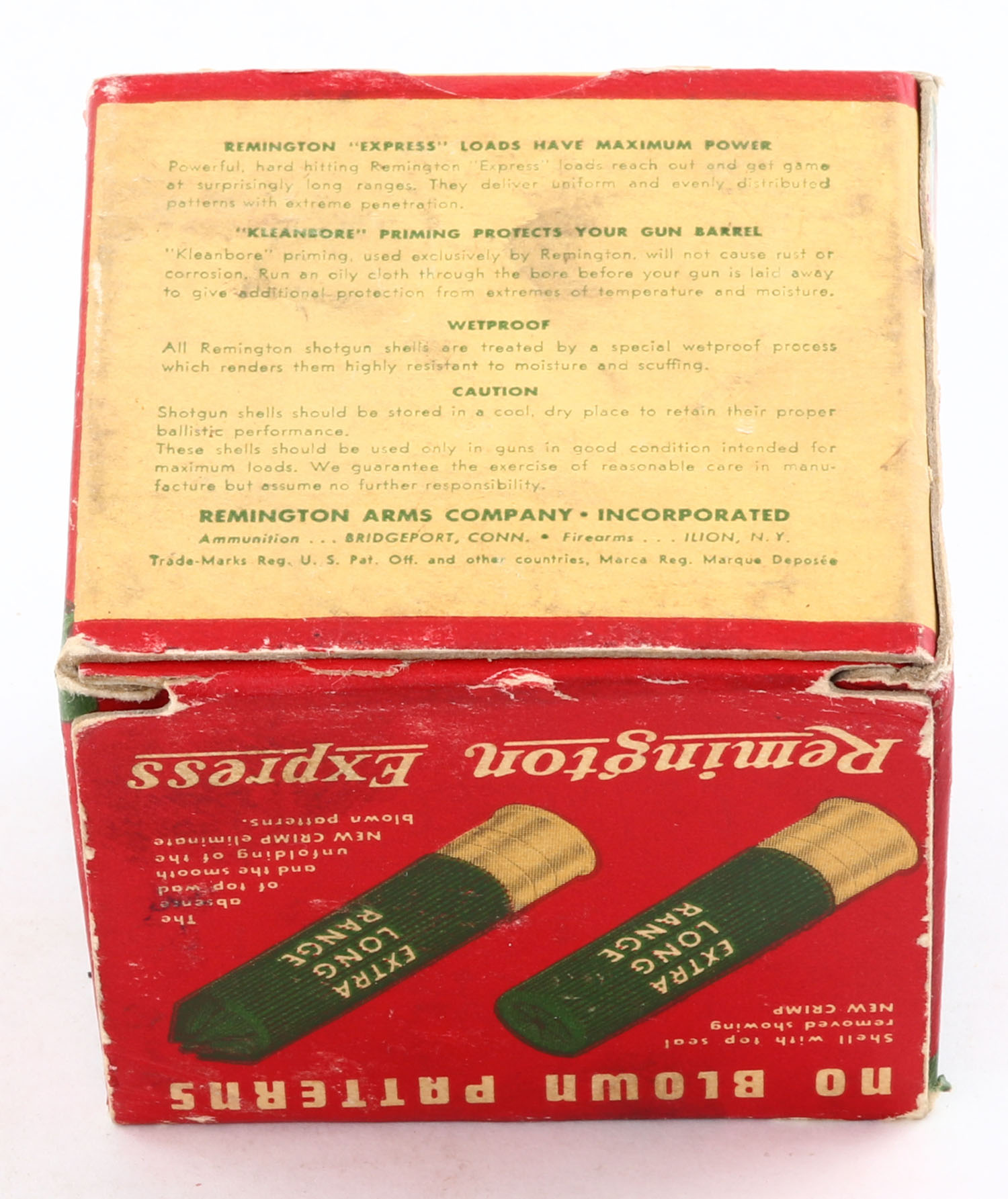 Remington Express, Extra Long Range, 28ga., 2 3/4'', 1pc., Full, shot size 4, box is white, yellow, red and green, box has light scuffing & edge wear, paper shells are very good. Grade: Very Good ++ - Value: 20 to 50