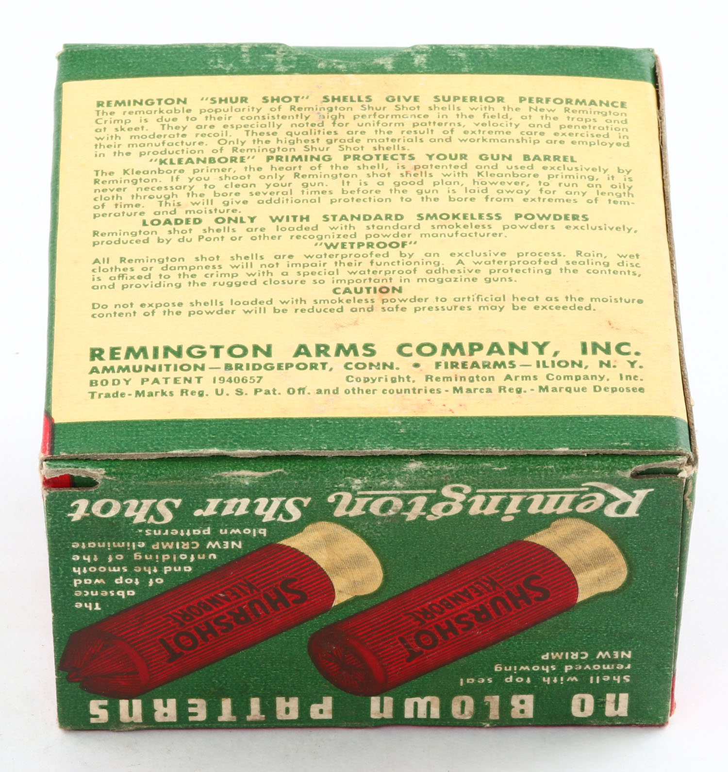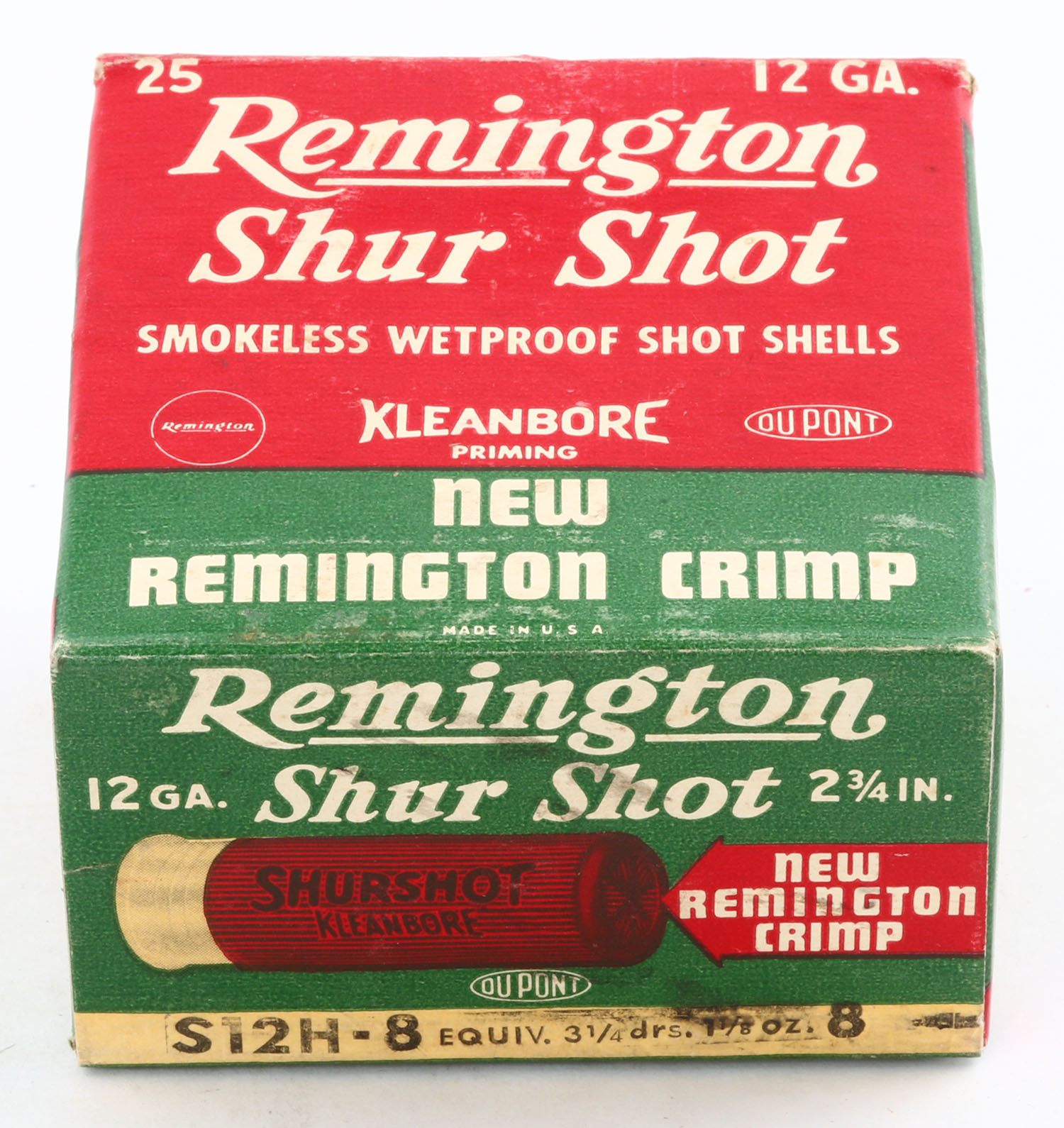 Remington Shur Shot, 12ga., 2 3/4'', 1pc., Full, shot size 8, box is white, yellow, red and green, box is very solid with excellent colors, paper shells are excellent. Grade: Very Good ++ - Value: 10 to 40