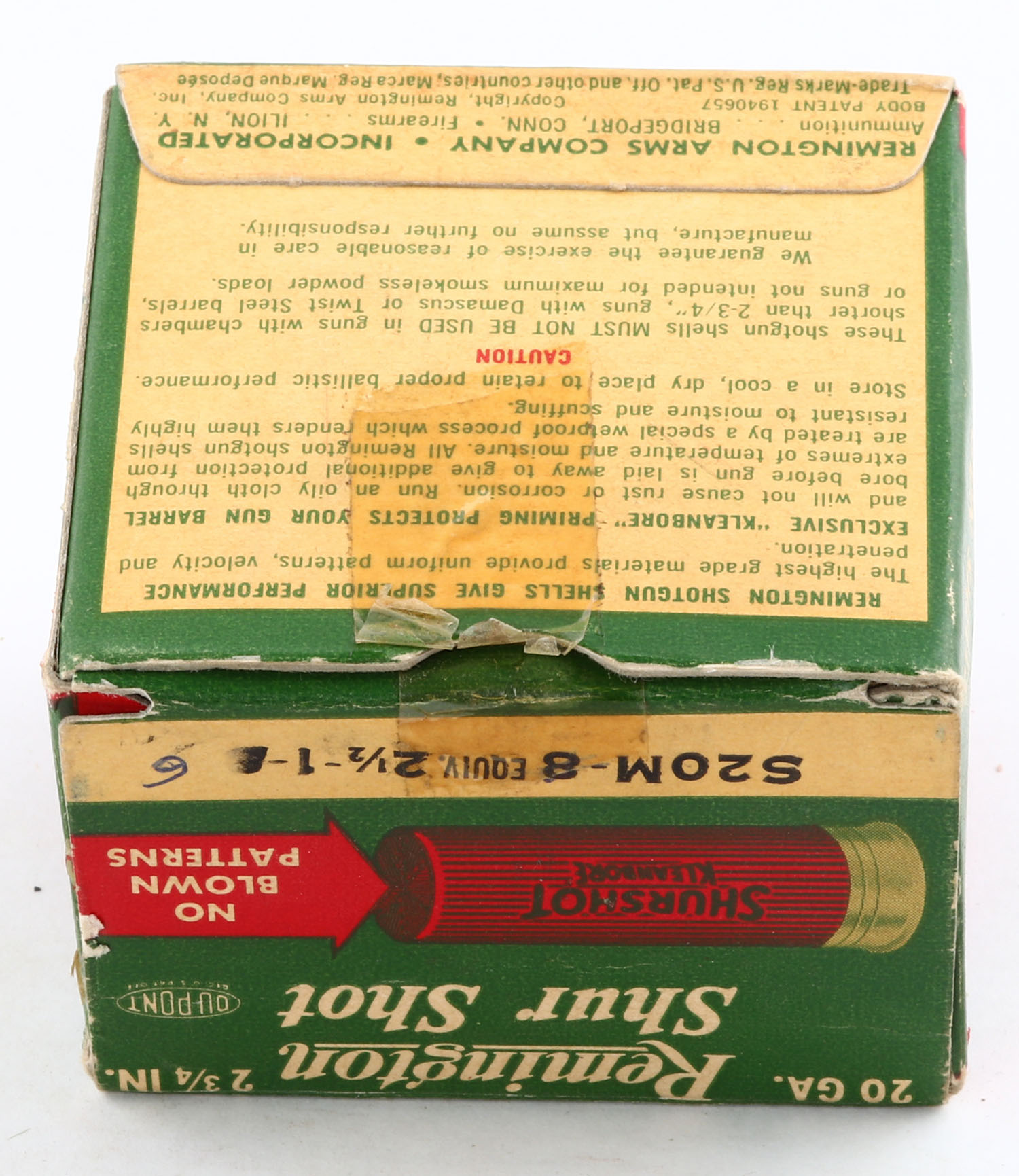 Remington, Shur Shot, 20ga., 2 3/4'', 1pc., Full of wrong shot, shot size 6, box is red, white and green, box is solid with great colors, plastic shells are very good. Grade: Very Good - Value: 10 to 30