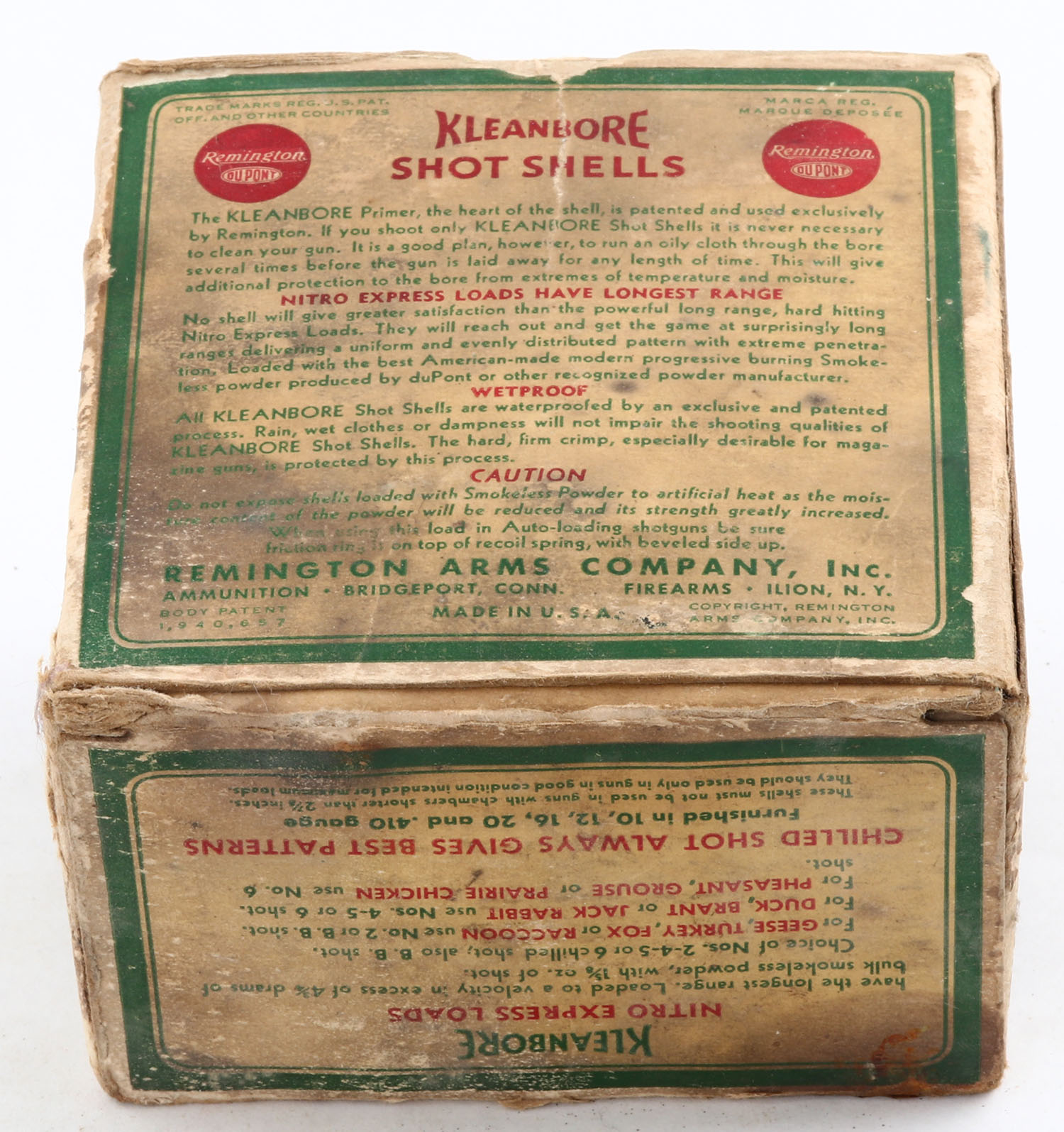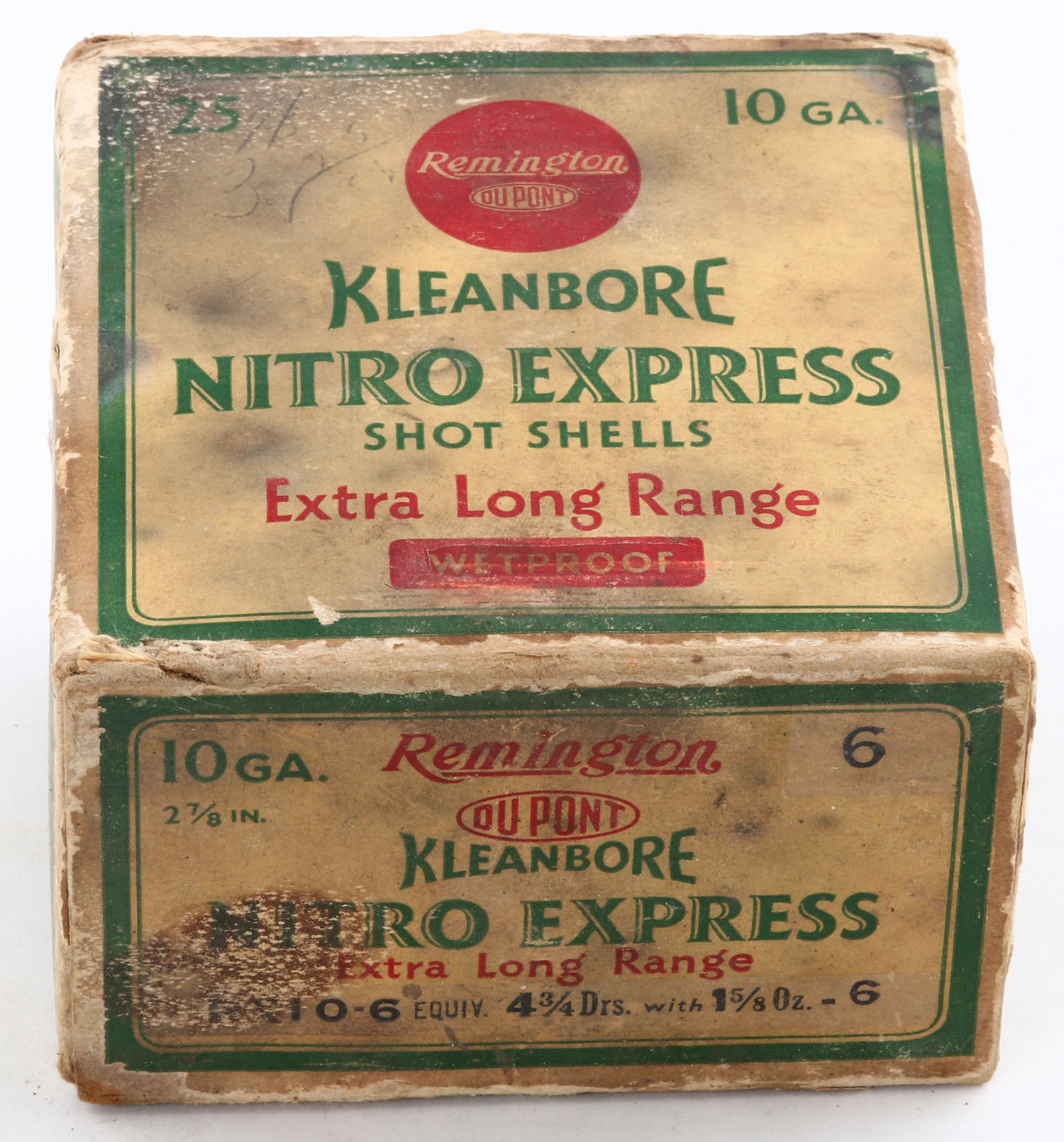 Remington Kleanbore, NITRO EXPRESS, 10ga., 1pc., Full of mixed shells, shot size 6, box is yellow, red and green, box has soiling with scuffing & edge wear, paper shells are poor. Grade: Poor ++ - Value: 16 to 40