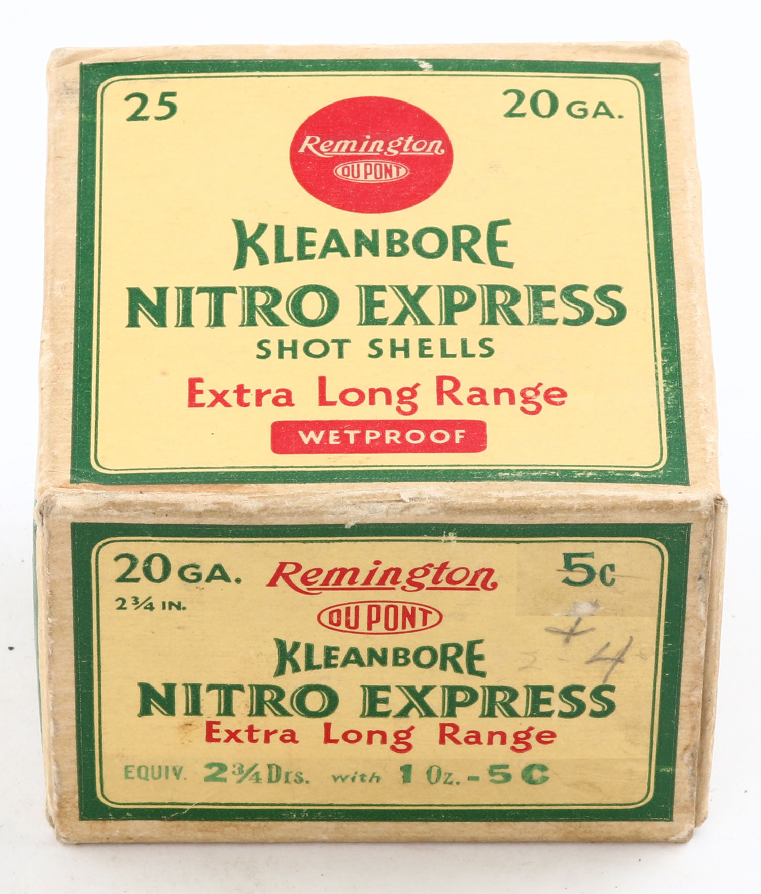 Remington, Kleanbore, NITRO EXPRESS, 20ga., 1pc., Full with 19rds. Being correct, shot size 5C, box is yellow, red and green, box is solid, has light scuffing with great colors, paper shells are very good. Grade: Very Good + - Value: 20 to 60
