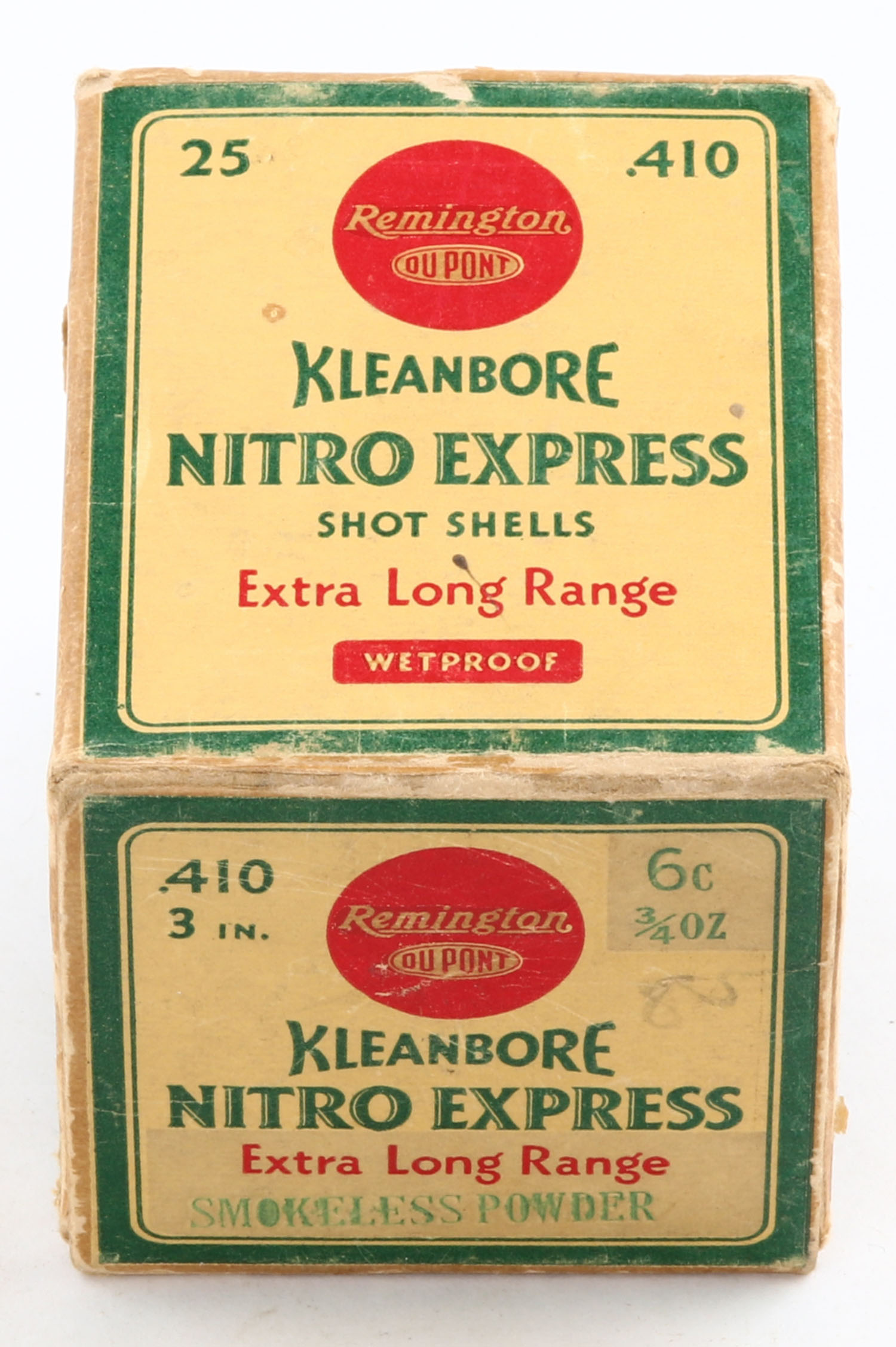 Remington Kleanbore, NITRO EXPRESS, 410ga., 3'', 1pc., Partial 19rds., shot size 6 C, box is yellow, red and green, box has light edge wear with scuffing, paper shells are excellent. Grade: Very Good - Value: 20 to 50