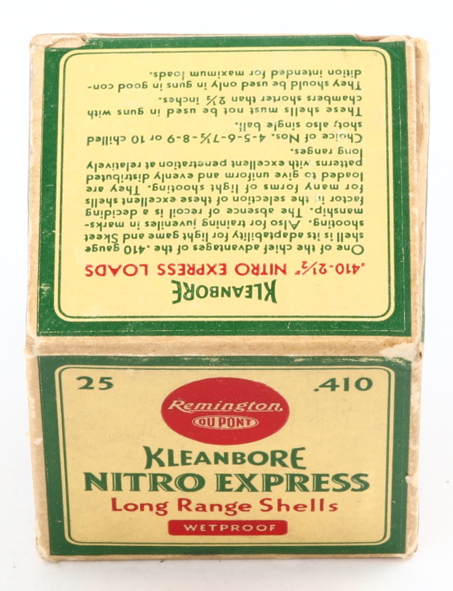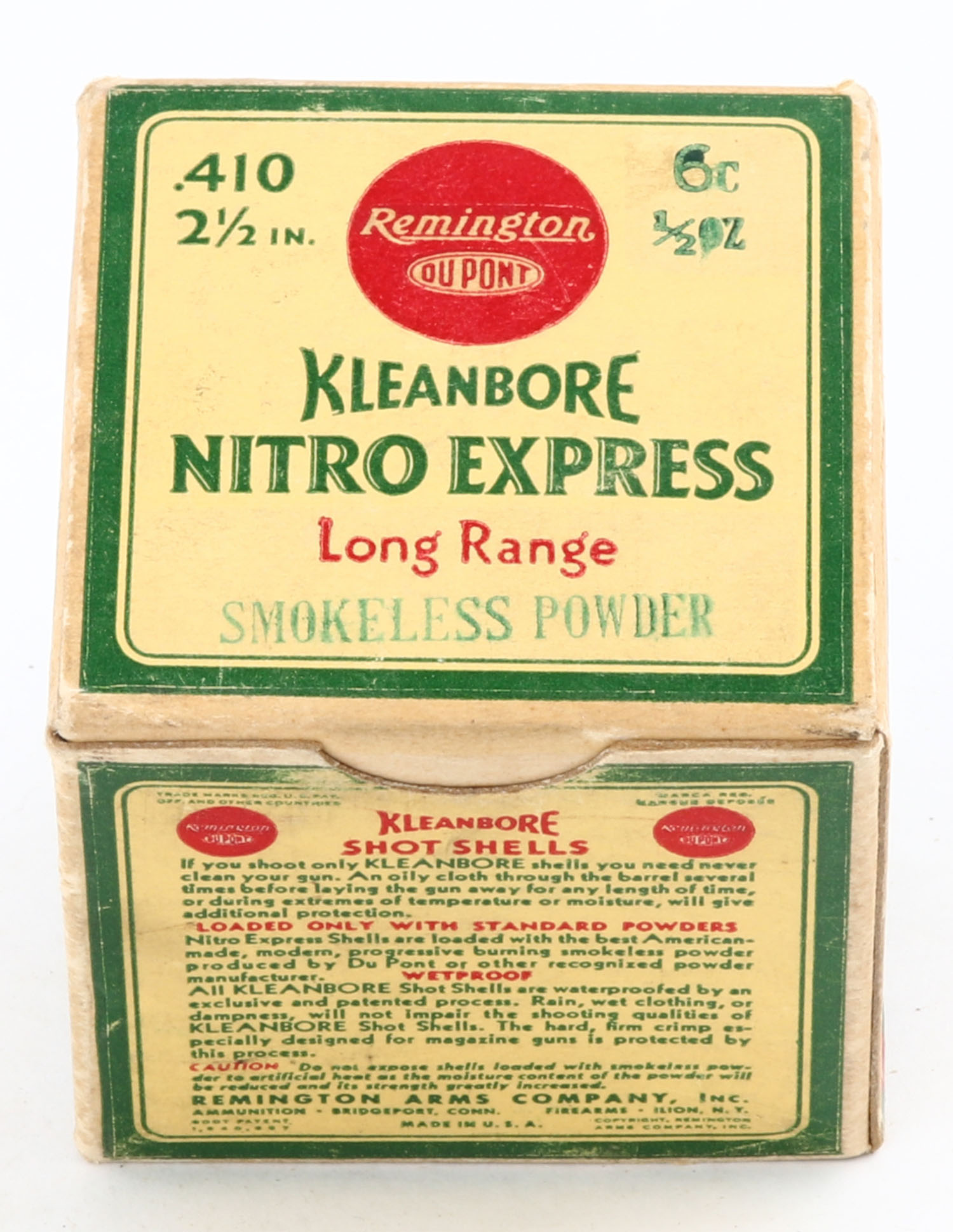Remington, Kleanbore, NITRO EXPRESS, 410ga., 2 1/2'', 1pc., Full, shot size 6 C, box is buff, yellow, red and green, box has light edge wear with great colors, paper shells are excellent. Grade: Very Good ++ - Value: 20 to 60