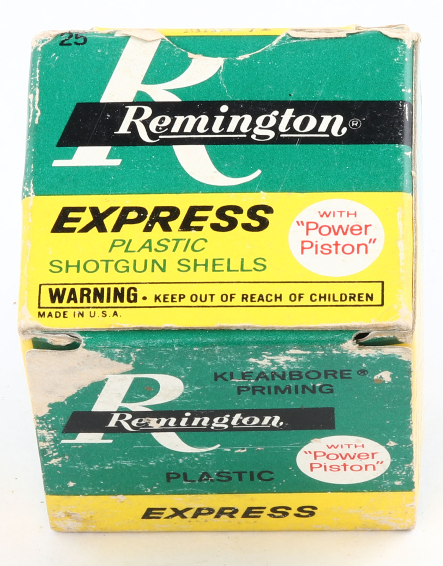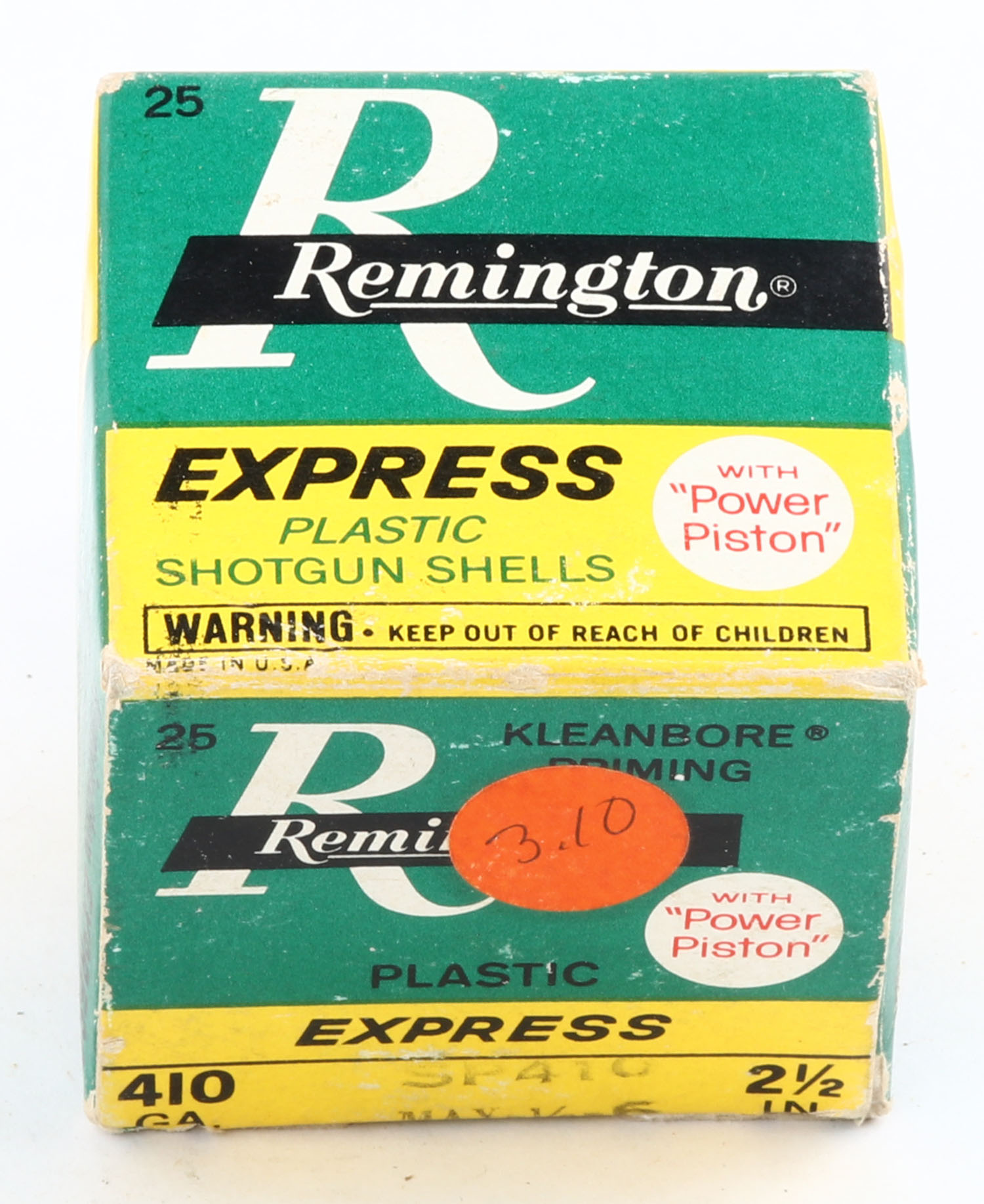 Remington, Express, 410ga., 1pc., Partial 24rds., shot size 6, multi-colored box, plastic shells are excellent. Grade: Very Good - Value: 10 to 30