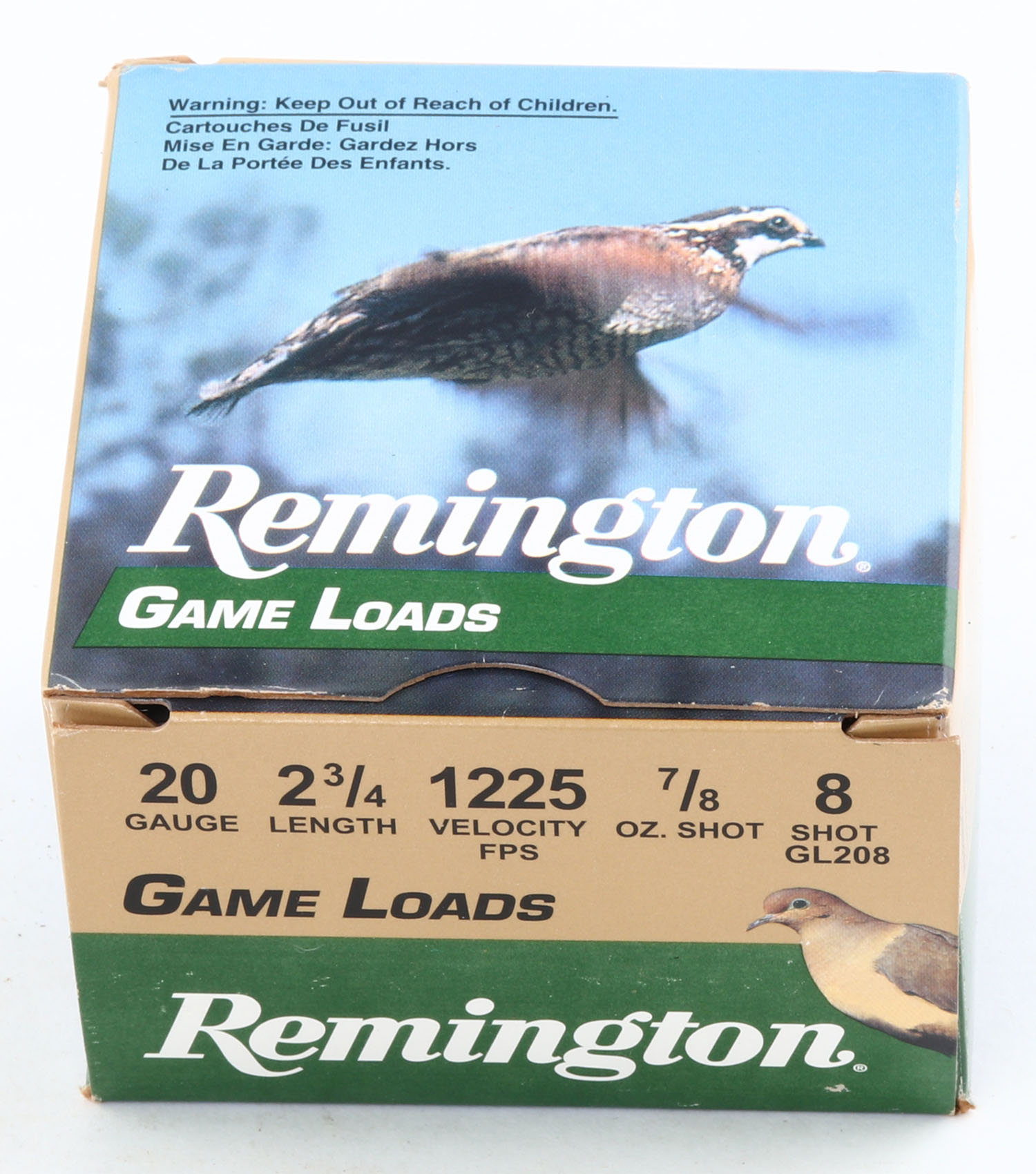 Remington Game Loads, 20ga., 2 3/4'', 1pc., Full, shot size 8, multi-colored box, box is very solid with great colors, plastic shells are excellent. Grade: Excellent ++ - Value: 10 to 30
