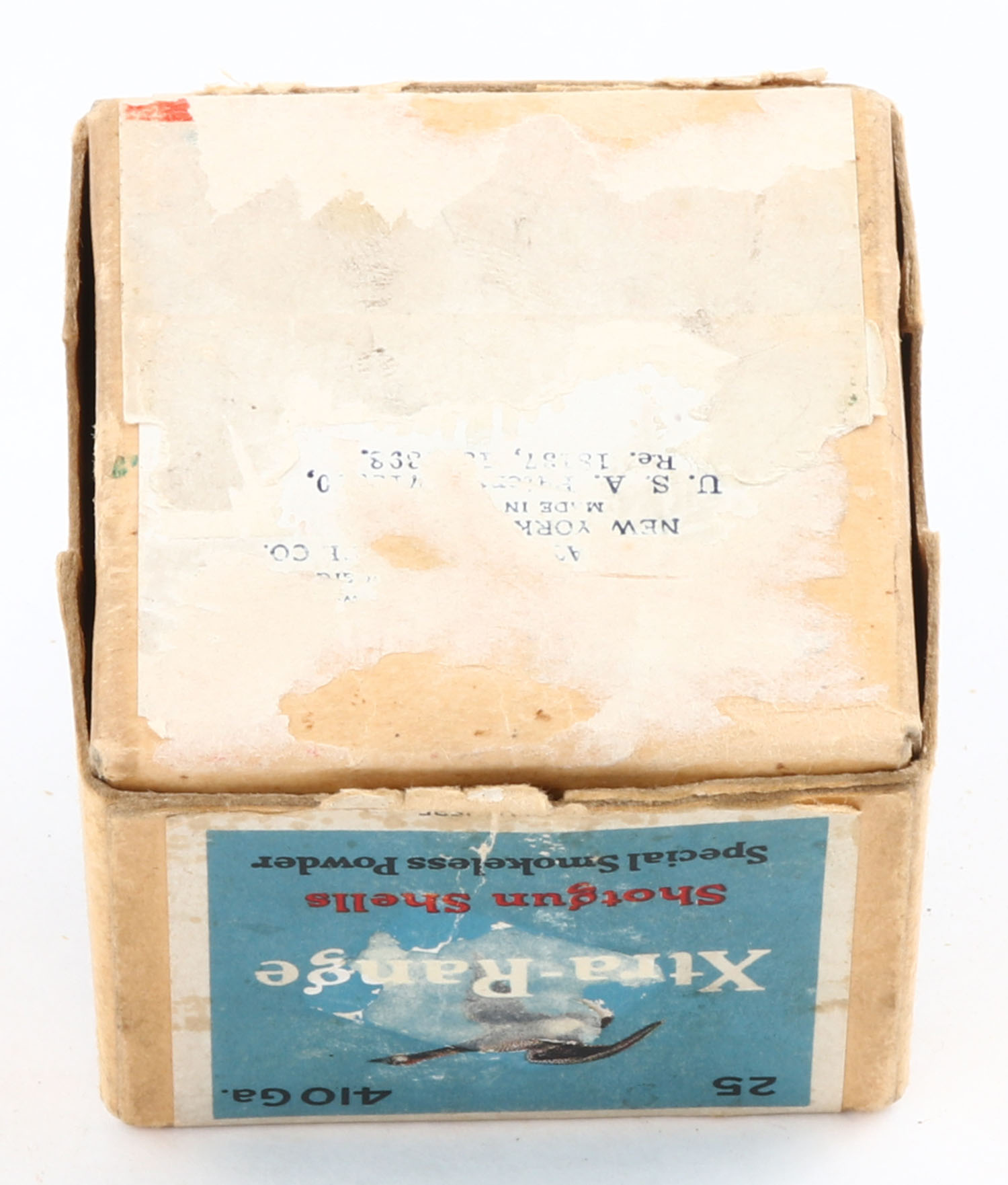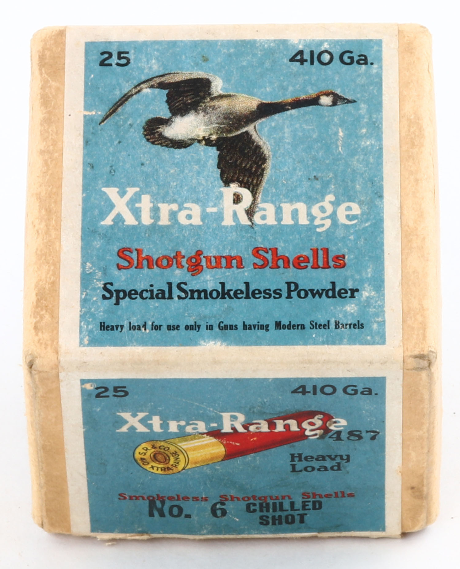 Sears Roebuck and Co., XTRA-RANGE, 410ga., 2pc., Empty, shot size 6 Chilled Shot, buff box with multi colored label that pictures a Goose flying, box has incorrect bottom label, box has light age soiling with light edge wear with excellent color to label. Grade: Very Good + - Value: 60 to 200