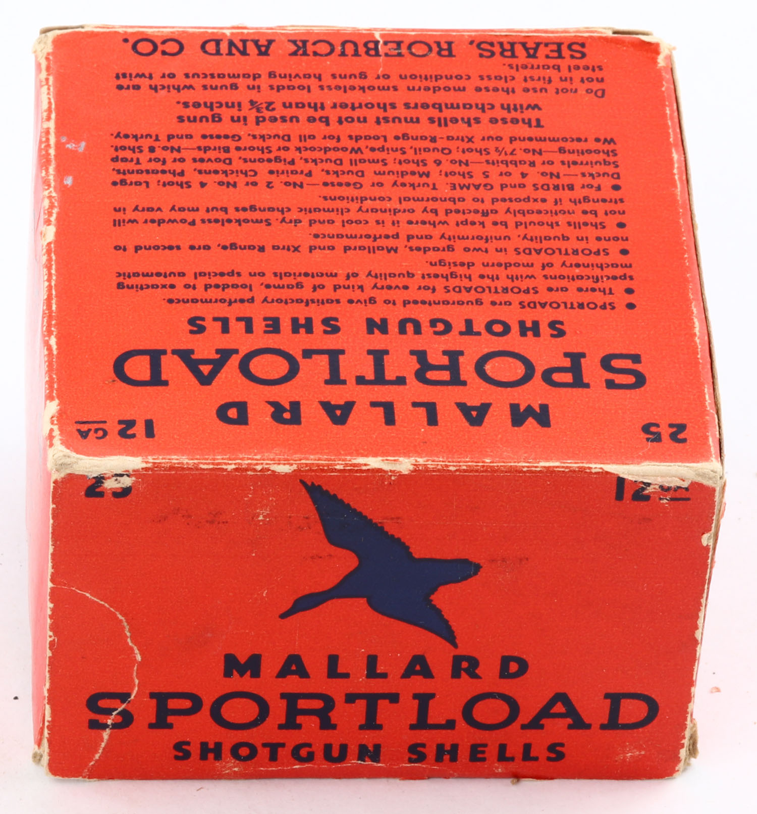 Sears, Sportload MALLARD, 12ga., 1pc., Full with 24rds being correct, shot size 7 1/2ch, red & blue box that pictures a Mallard in flight, box has edge wear with nice colors, paper shells are excellent. Grade: Very Good ++ - Value: 40 to 80