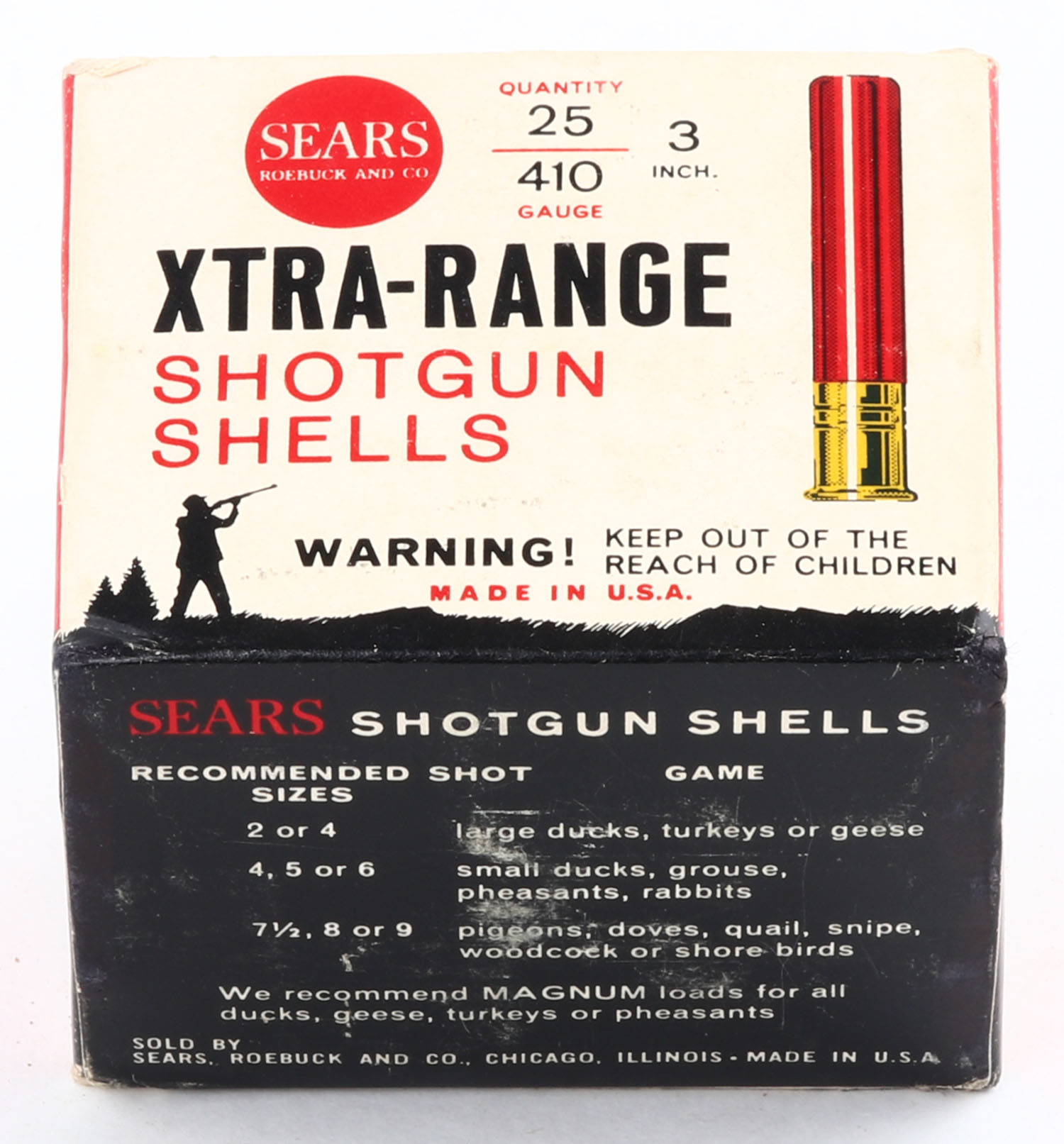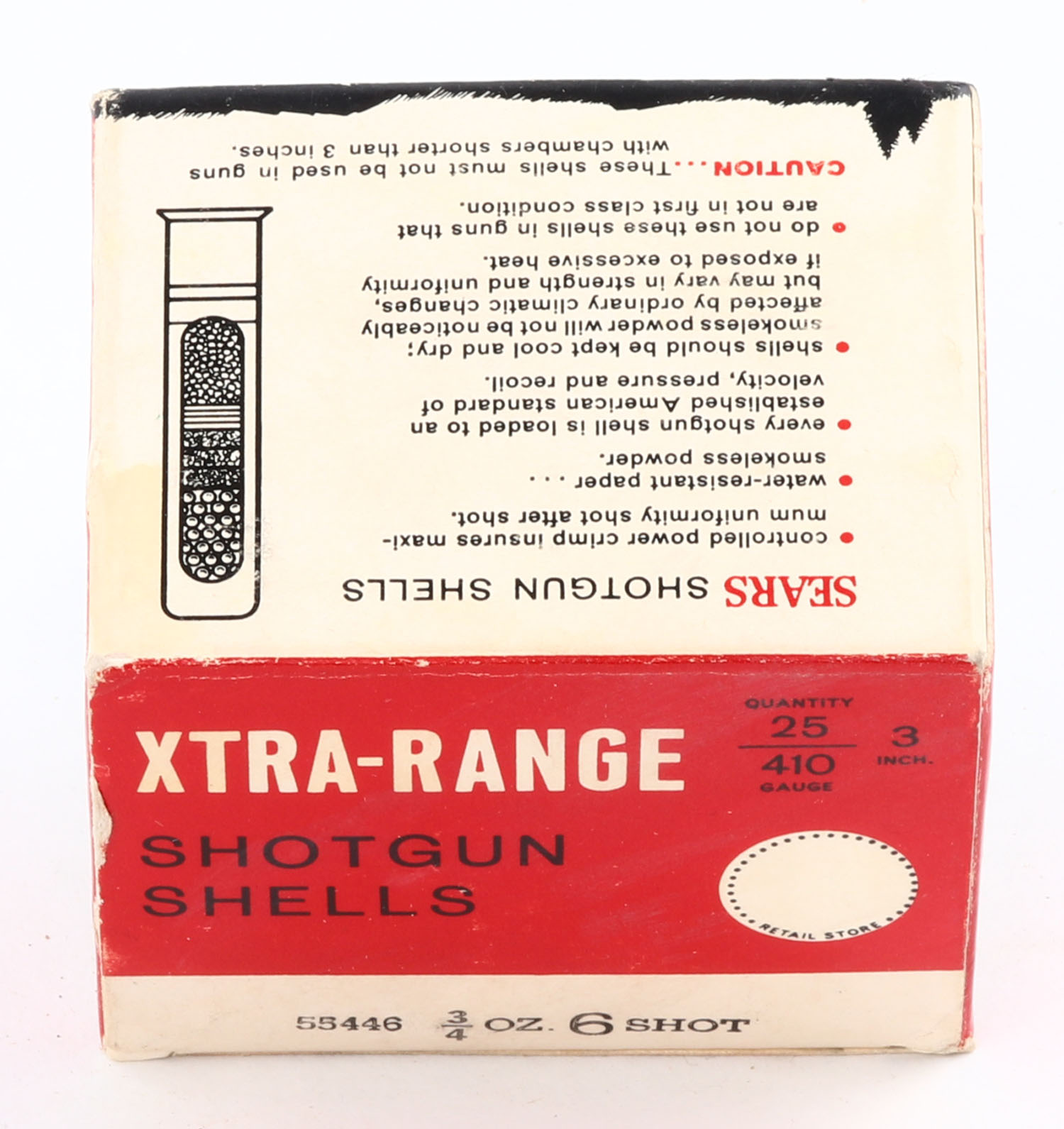 Sears, Xtra-Range, 410ga., 1pc., Full, Shot Size 6, 3'', box is very solid, paper shells are excellent. Grade: Very Good ++ - Value: 10 to 40