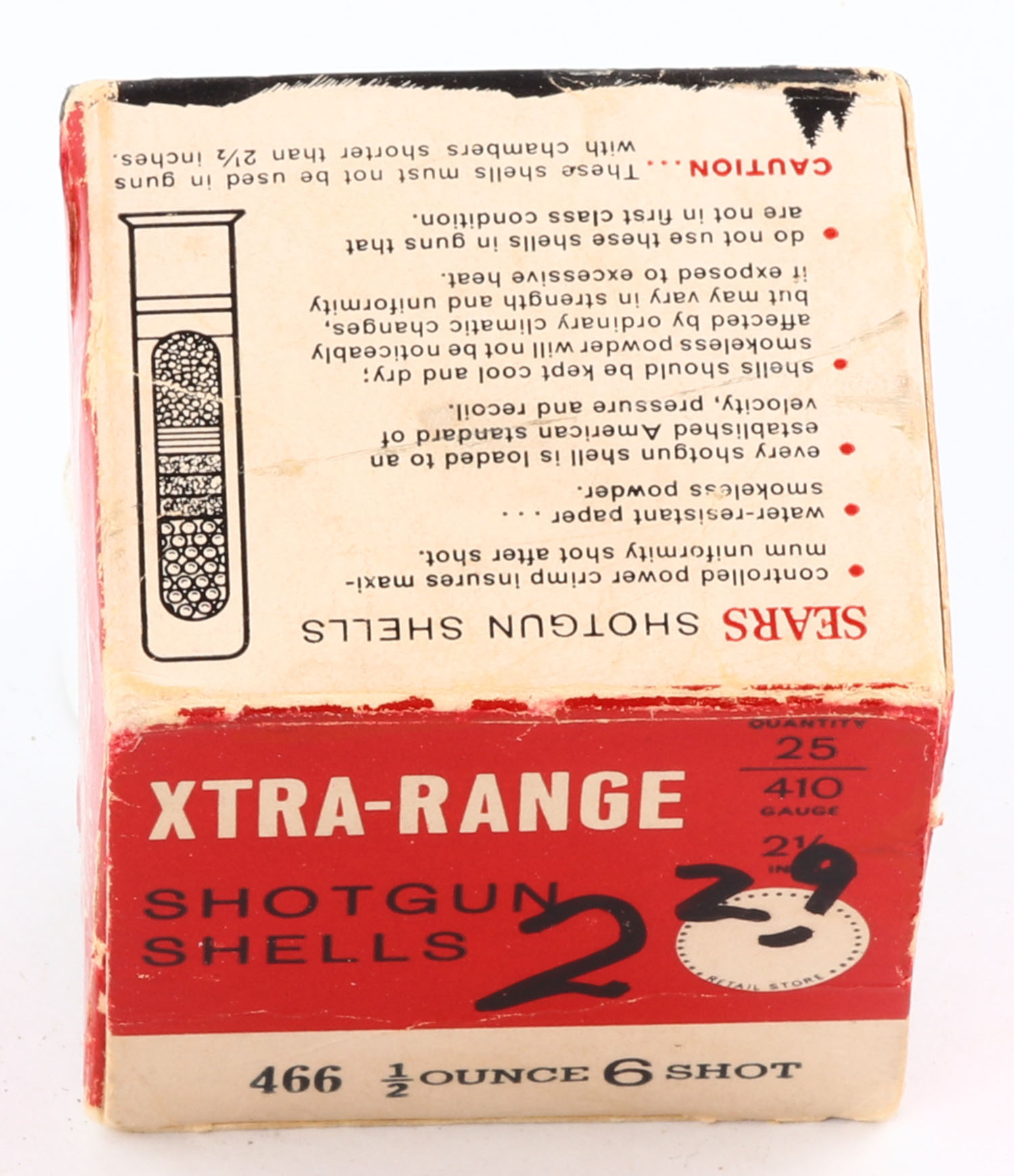 Sears, Xtra-Range, 410ga., 1pc., Full, Shot Size 6, 2 1/2'', box is very solid, paper shells are excellent. Grade: Very Good ++ - Value: 10 to 40