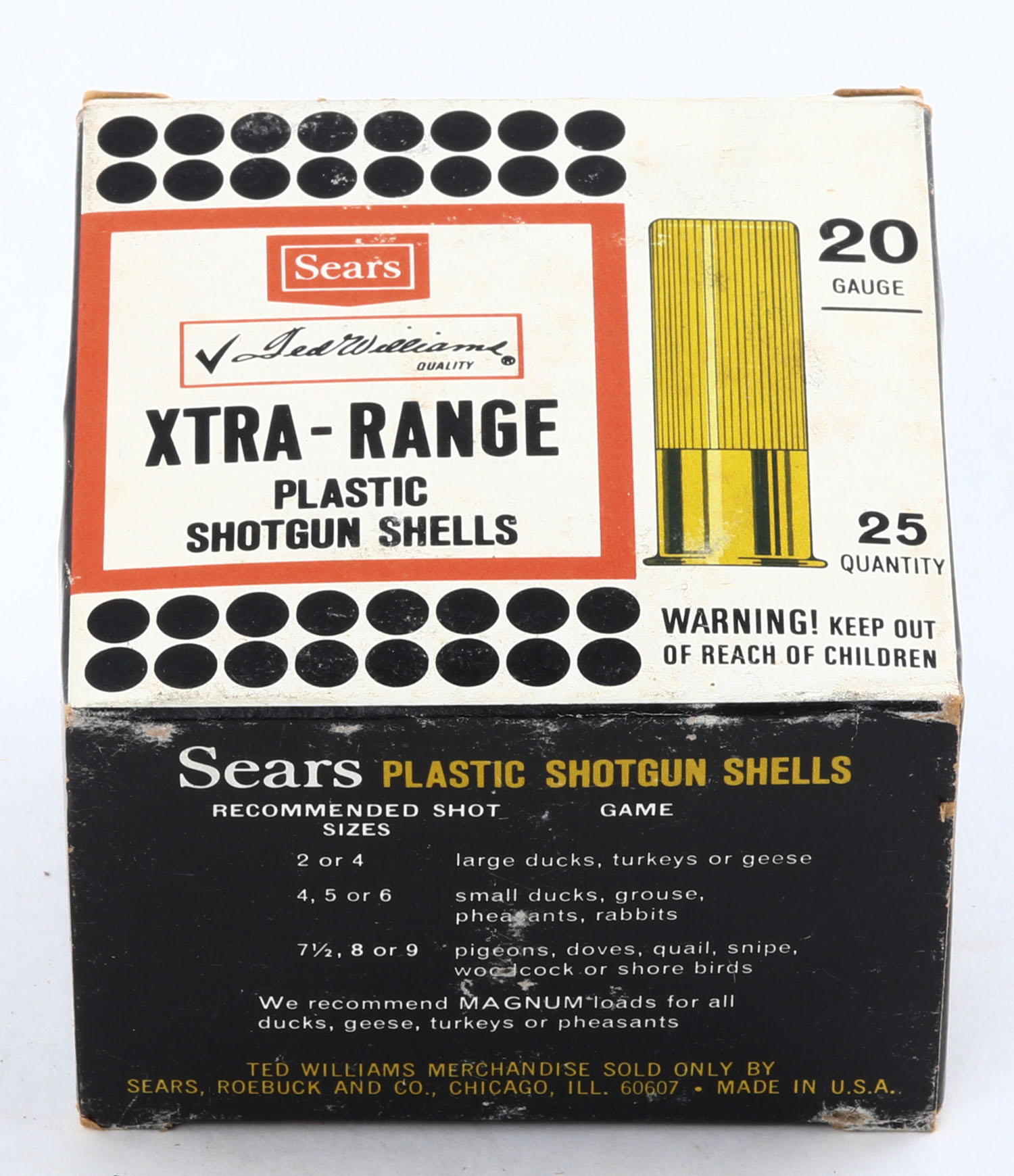 Sears, Xtra-Range, 20ga., 1pc., Full, shot size 6, multi-colored box, box is solid, plastic shells are excellent. Grade: Very Good - Value: 10 to 40