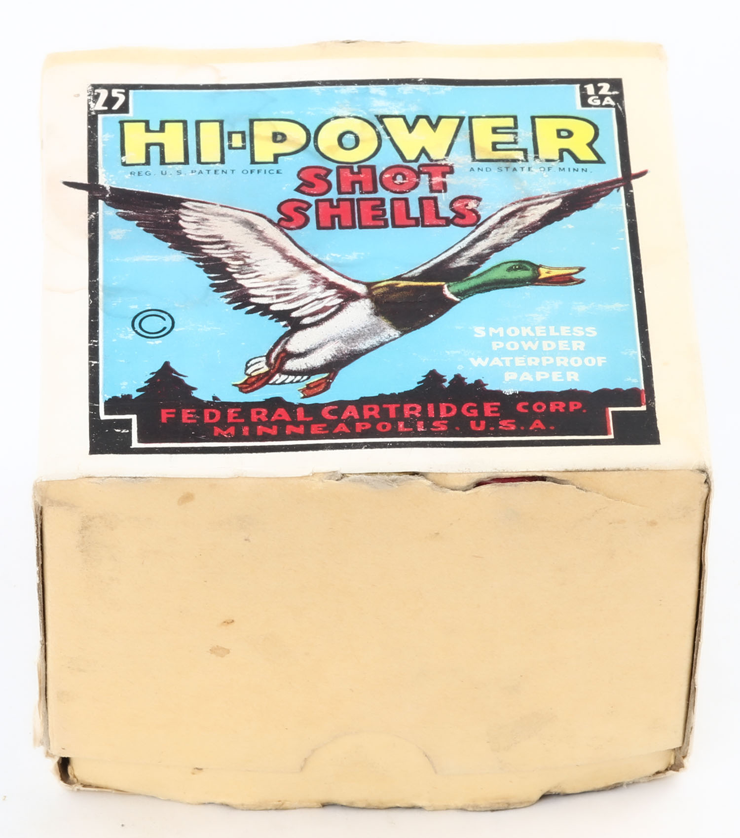 Federal Cart. Co., HI-POWER, 12ga., 2 PIECE!, FULL & SEALED, Loading: Magnum 3''- 1 5/8- 2 Shot, buff box with multi colored label that pictures Mallard in flight, box has seam splits to top & bottom with shell protrusion, box has very minor age soiling. Grade: Excellent - Value: 100 to 400