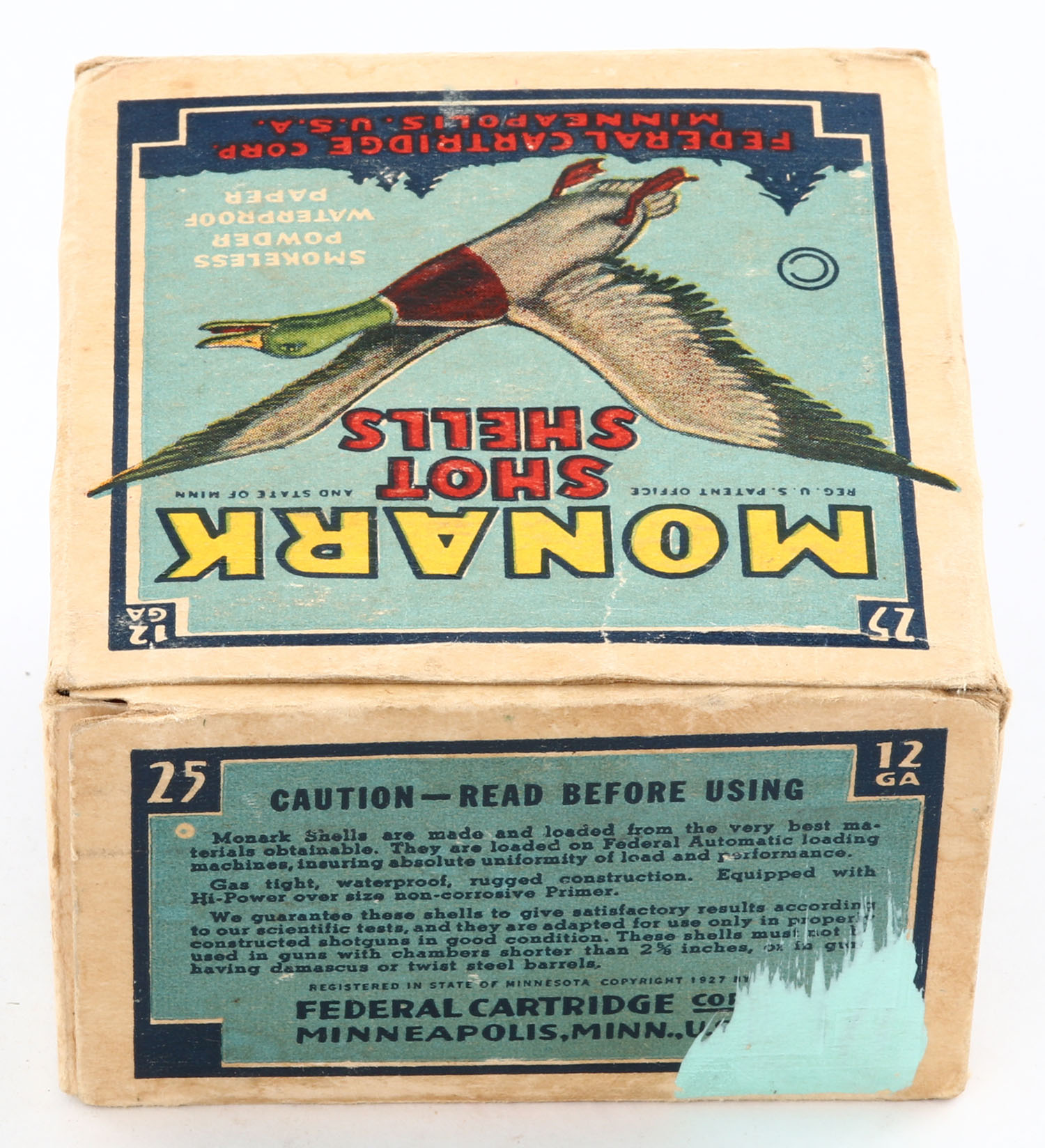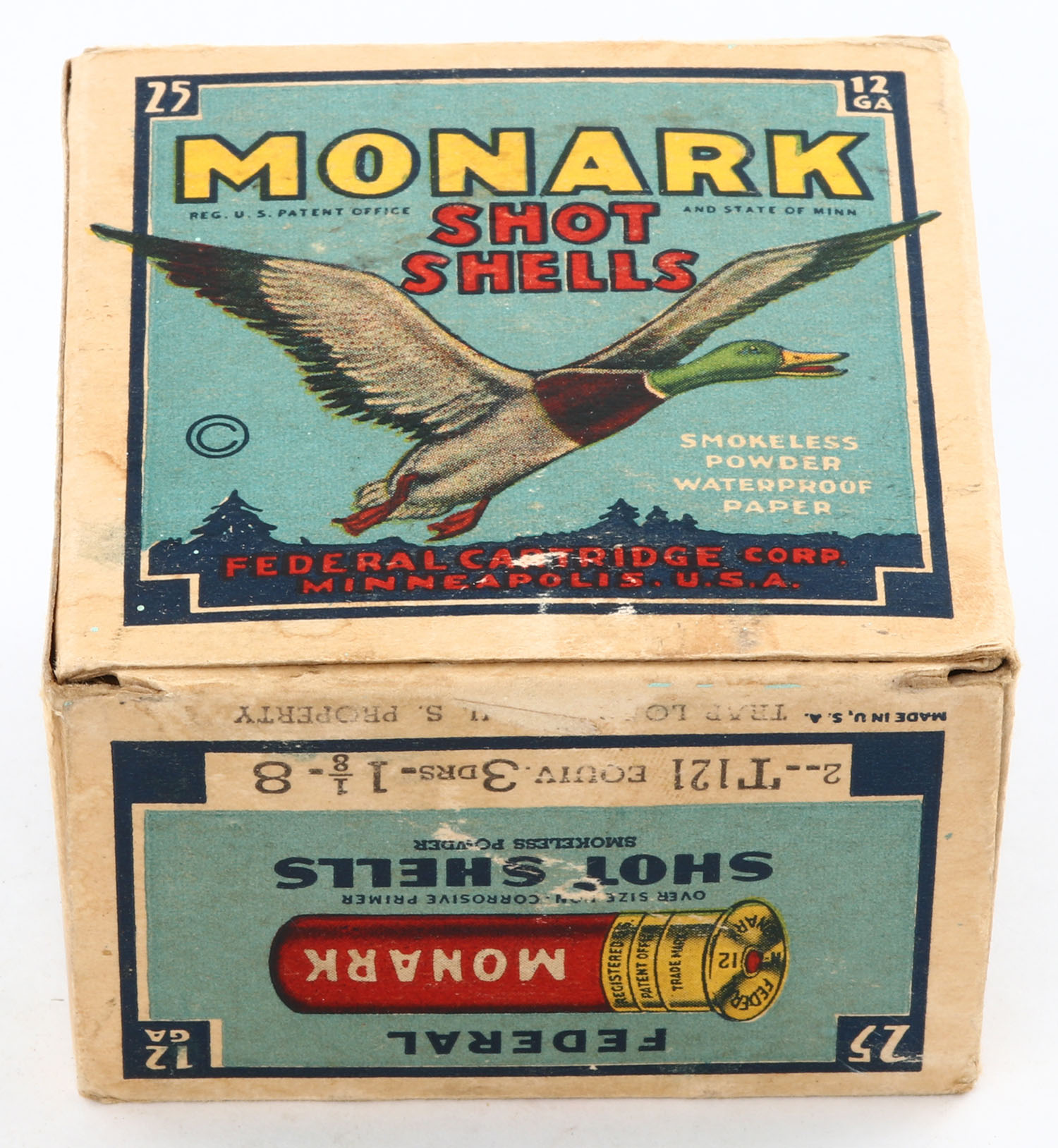 Federal Cart. Co., MONARK, U.S. PROPERTY TRAP SHELLS, 12Ga., 1pc., Full, shot size 8, Blue border, blue, yellow and red box with flying mallard, box has minor age soiling with a paint mark to top, paper shells are minty. Grade: Excellent - Value: 20 to 40
