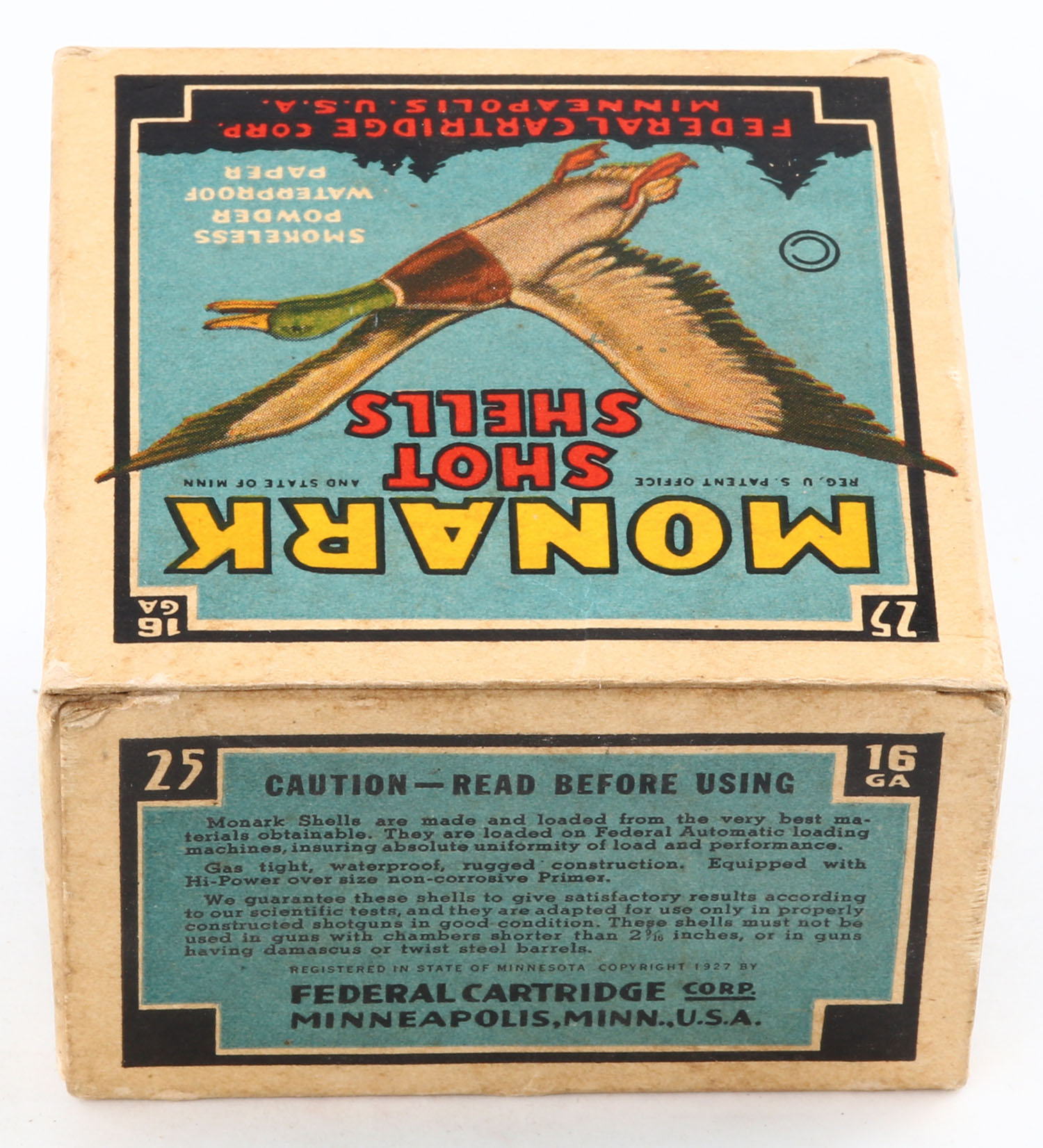 Federal Cart. Co., MONARK, 16ga., 1pc., Empty, shot size 7 1/2CH, Black border, blue, yellow and red box with flying mallard, box has light age soiling with pen marks. Grade: Very Good + - Value: 8 to 30
