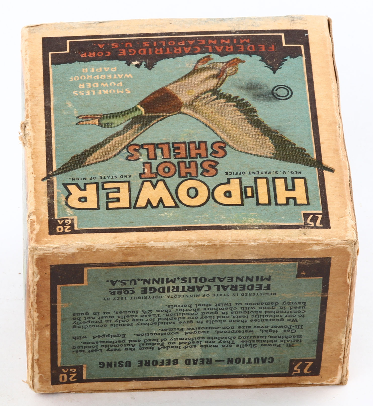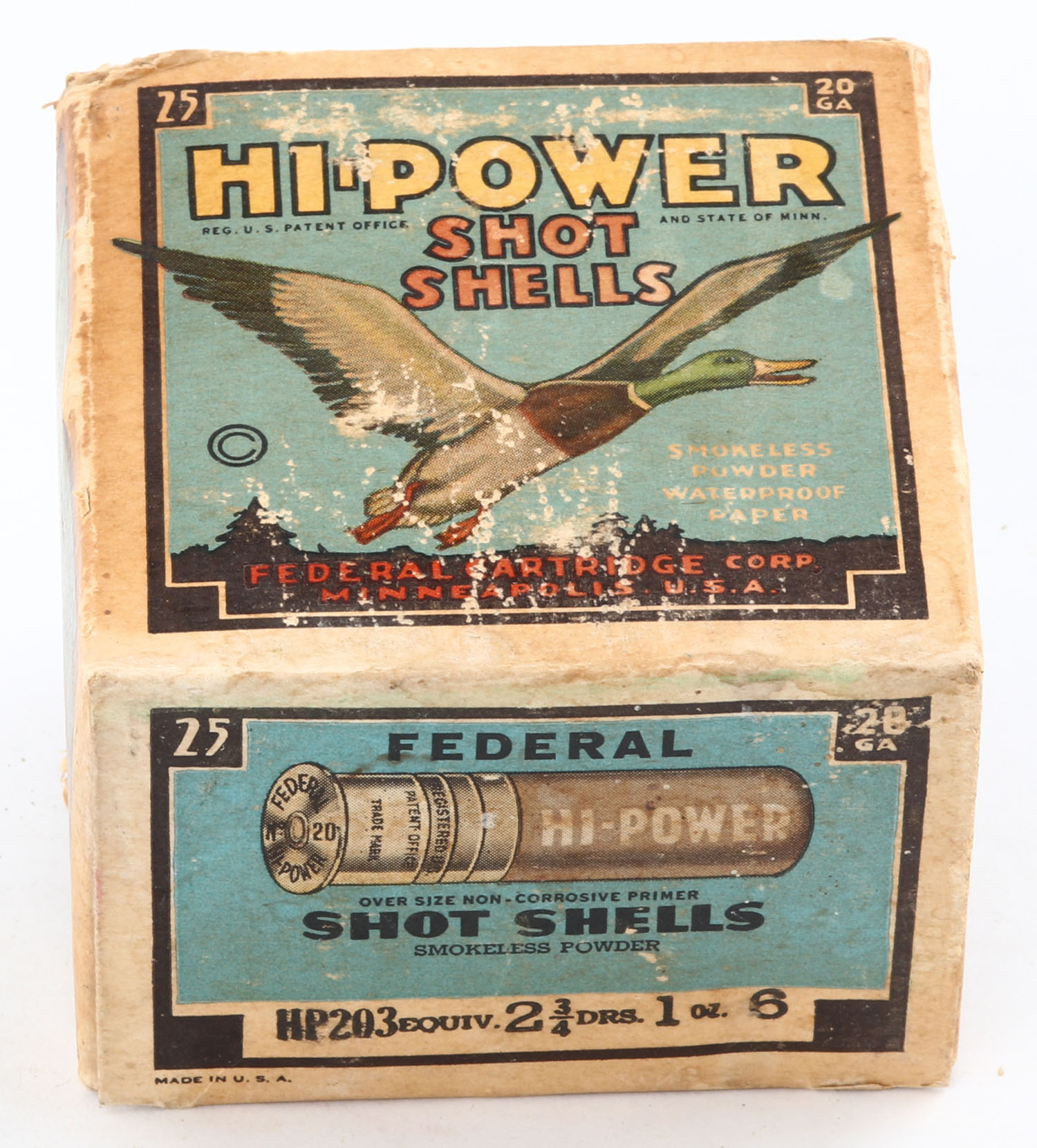 Federal Cart. Co., HI-POWER, 20ga., 1pc., Full, shot size 6, Black border, blue, yellow and red box with flying mallard, box has age soiling & scuffing with edge wear, paper shells are excellent. Grade: Very Good + - Value: 10 to 40