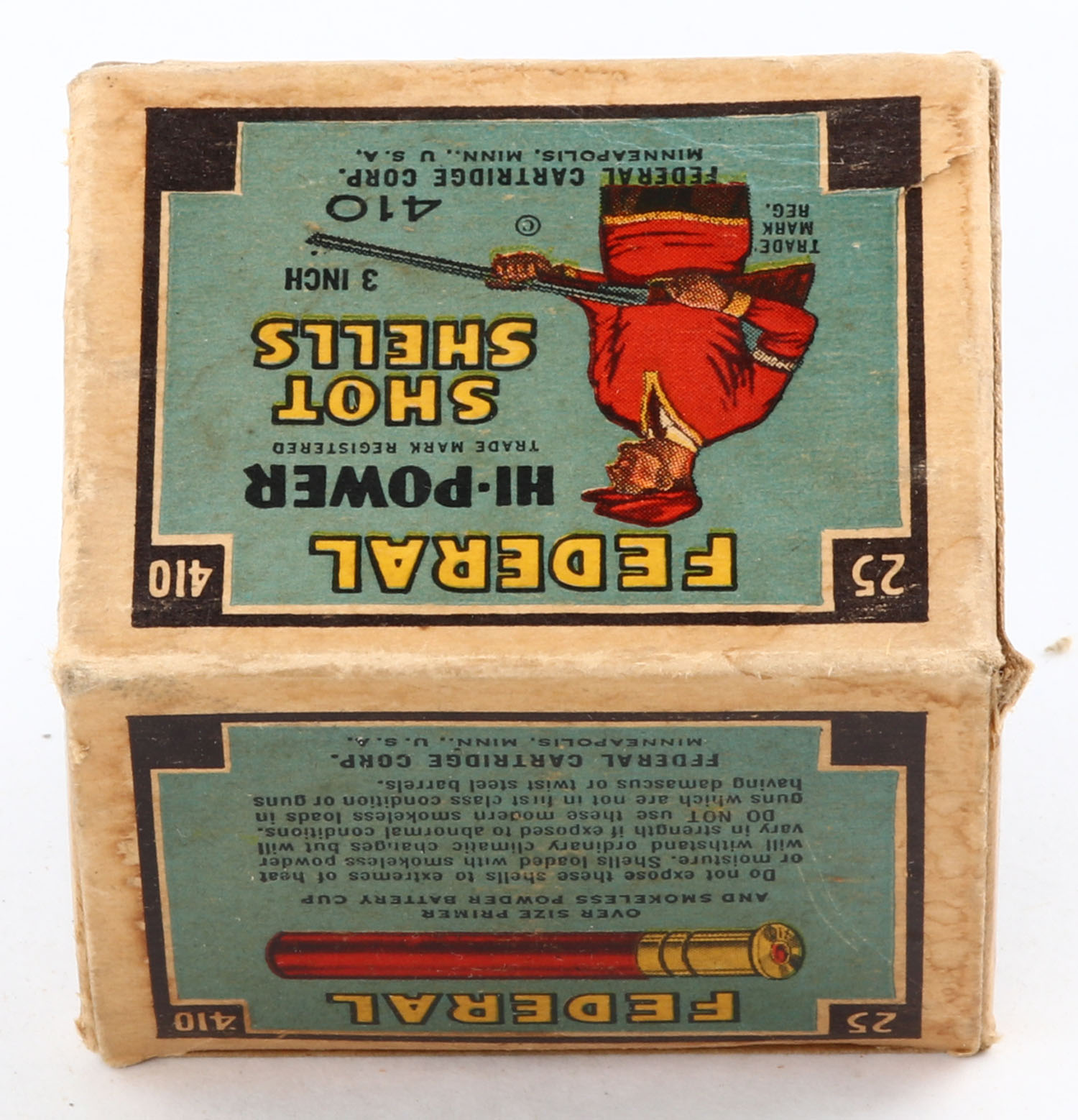 Federal Cart. Co., HI-POWER, 410ga., 3'', 1pc., Partial 11rds., shot size 9 Skeet, Black border, blue, yellow and red box with Trap Shooter, box has light soiling with great colors, paper shells are excellent. Grade: Very Good - Value: 10 to 40