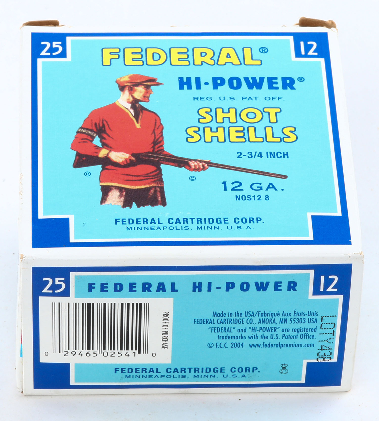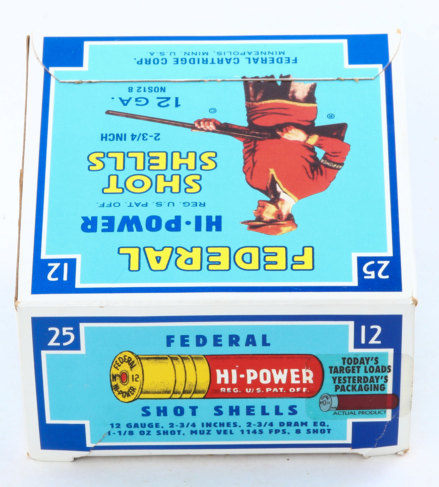 Federal Cart. Co., HI-POWER, 12ga., 2 3/4'', 1pc., Full, shot size 8, Blue border, blue, yellow and red box with Trap Shooter, box is minty with great colors, plastic shells are excellent. Grade: MINT - Value: 40 to 100
