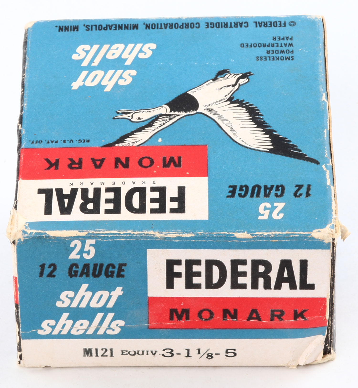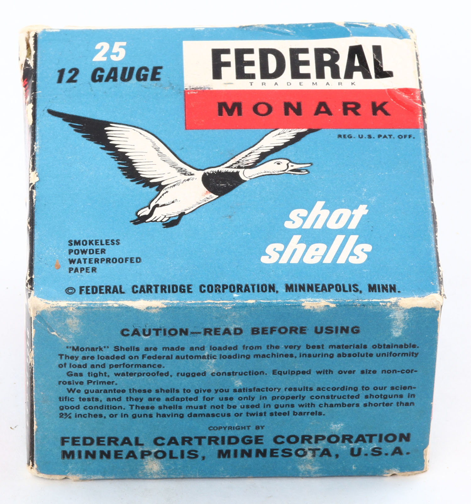 Federal, Monark, 12ga., 1pc., Full, shot size 5, 3'', multi-colored box, box has scuffing & edge wear, plastic shells are excellent. Grade: Vey Good - Value: 10 to 30