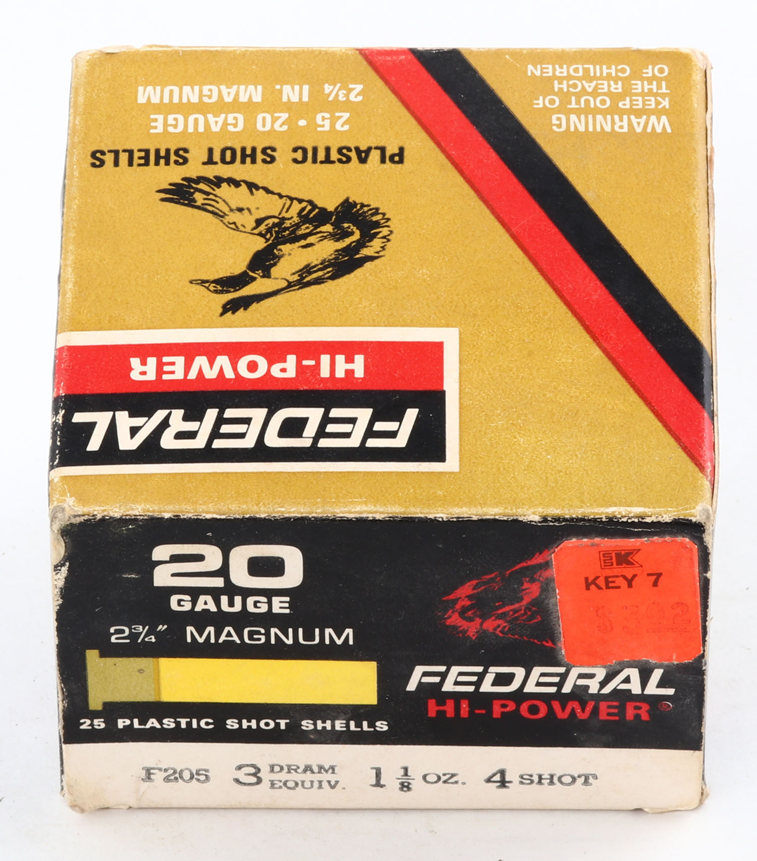 Federal, Hi-Power, 20ga., 2 3/4'', 1pc., Full, shot size 4 Magnum Load, multi-colored box, box is solid, plastic shells are good. Grade: Very Good ++ - Value: 10 to 40
