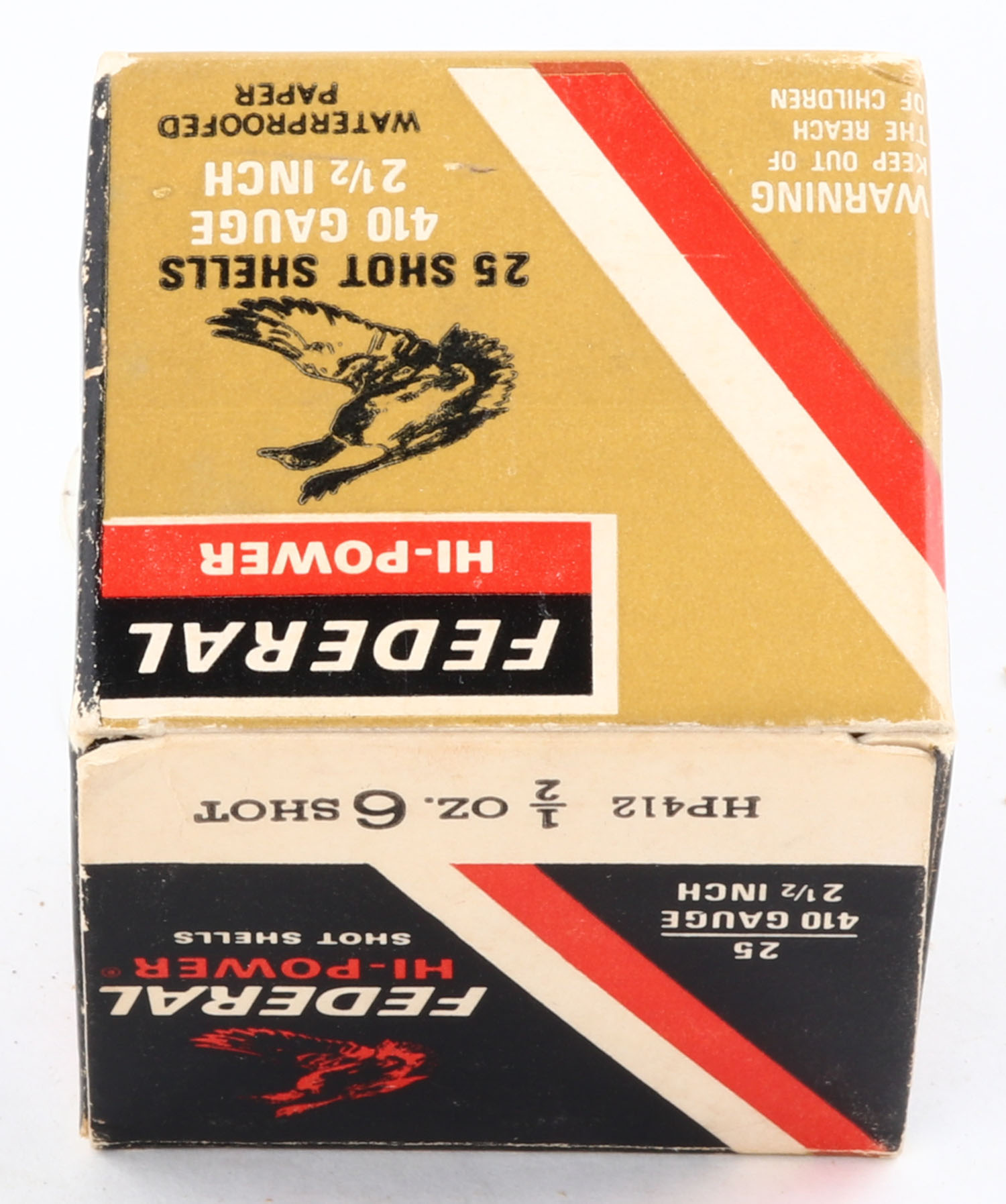 Federal, Hi-Power, 410ga., 1pc., Full, shot size 6, 2 1/2'', box is very solid with great colors, paper shells are excellent. Grade: Excellent + - Value: 10 to 30