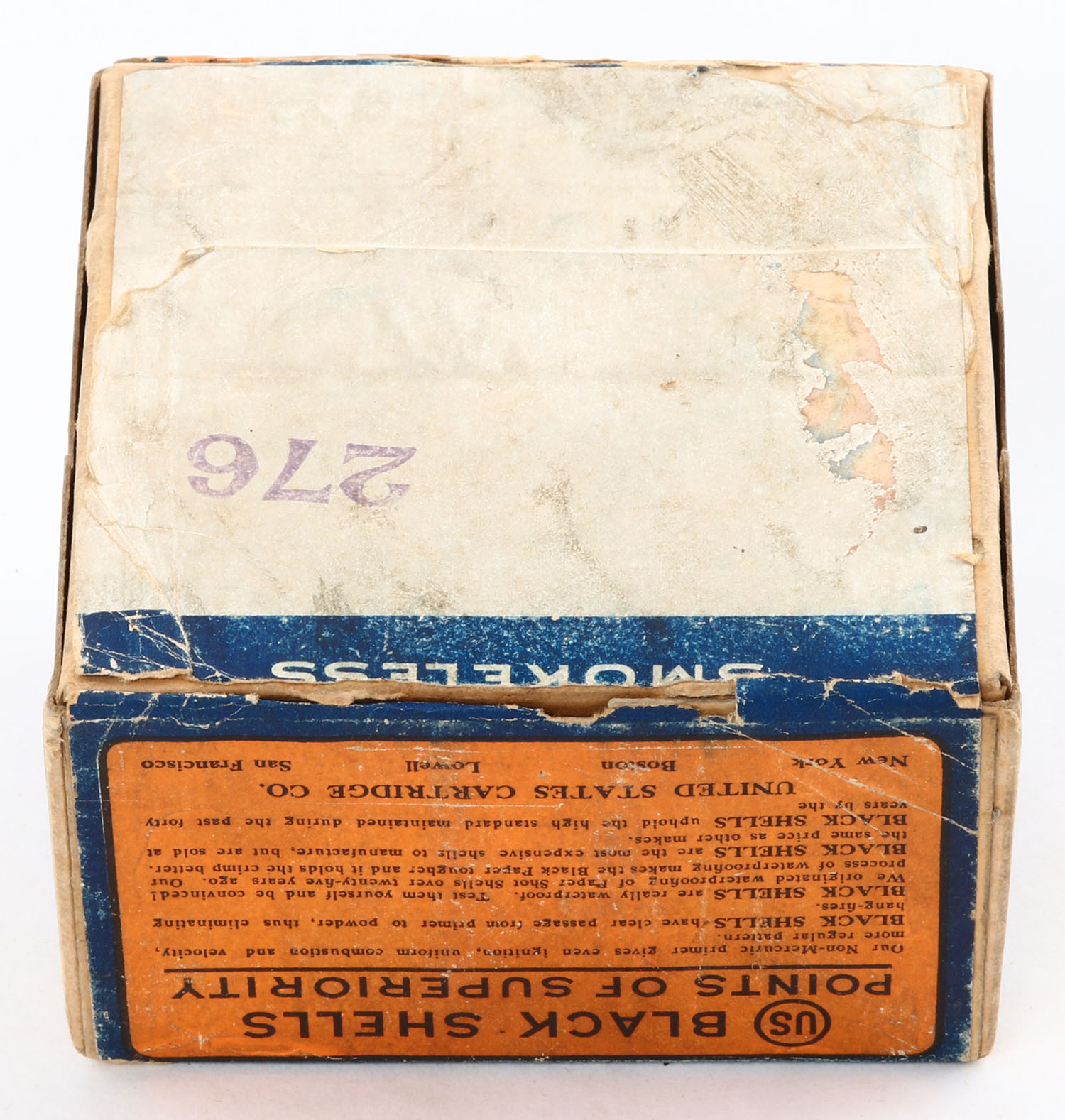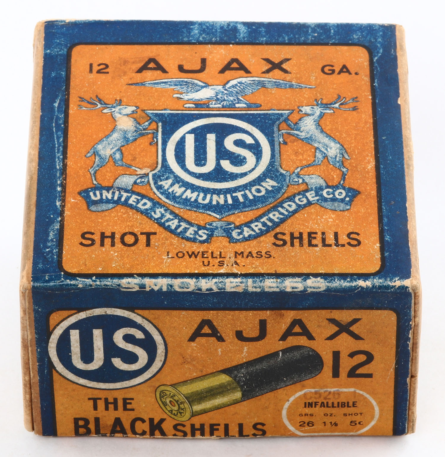 US Cart. Co., Lowell, Mass, Ajax, 12ga, 2pc., Empty, shot size 5C, buff box orange, blue & white label, box has light age soiling & edge wear with great colors. Grade: Excellent - Value: 20 to 80