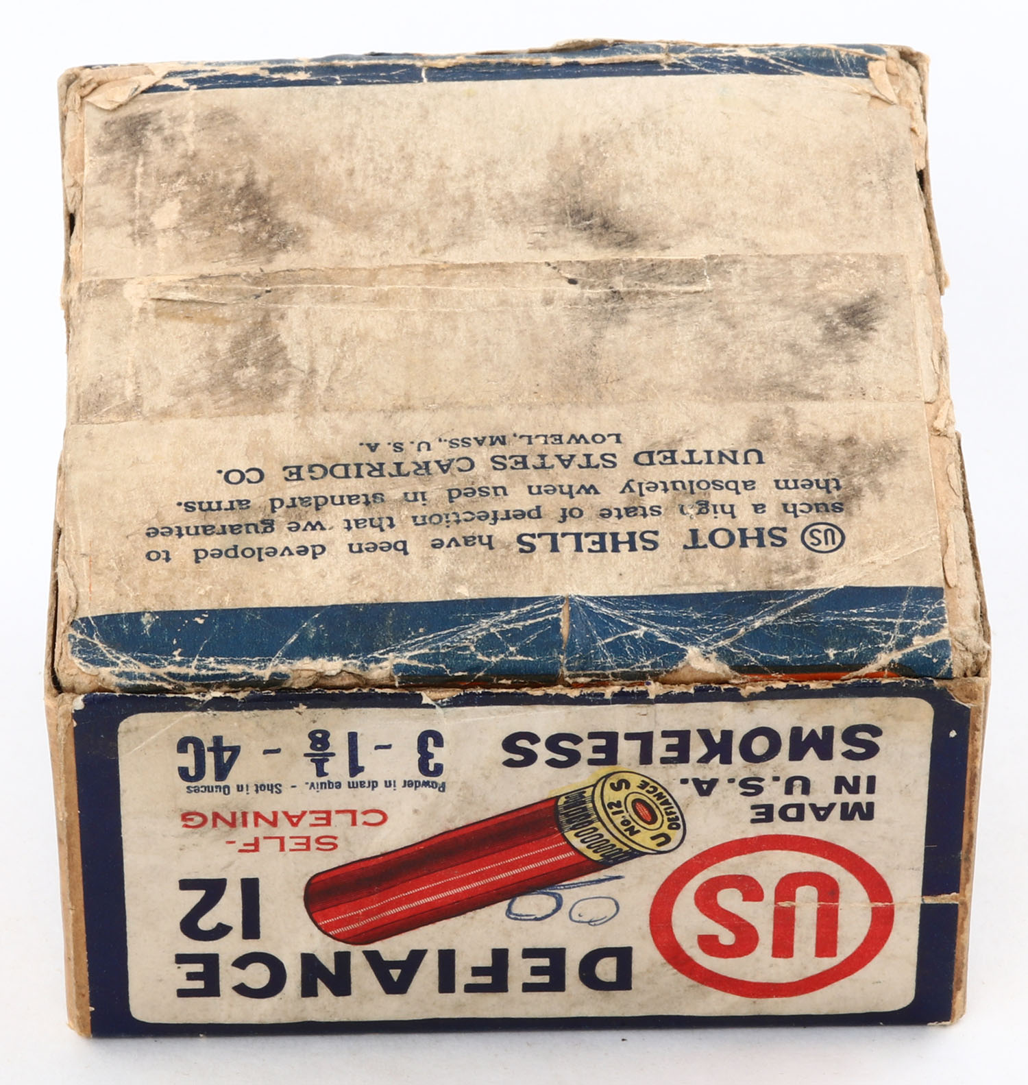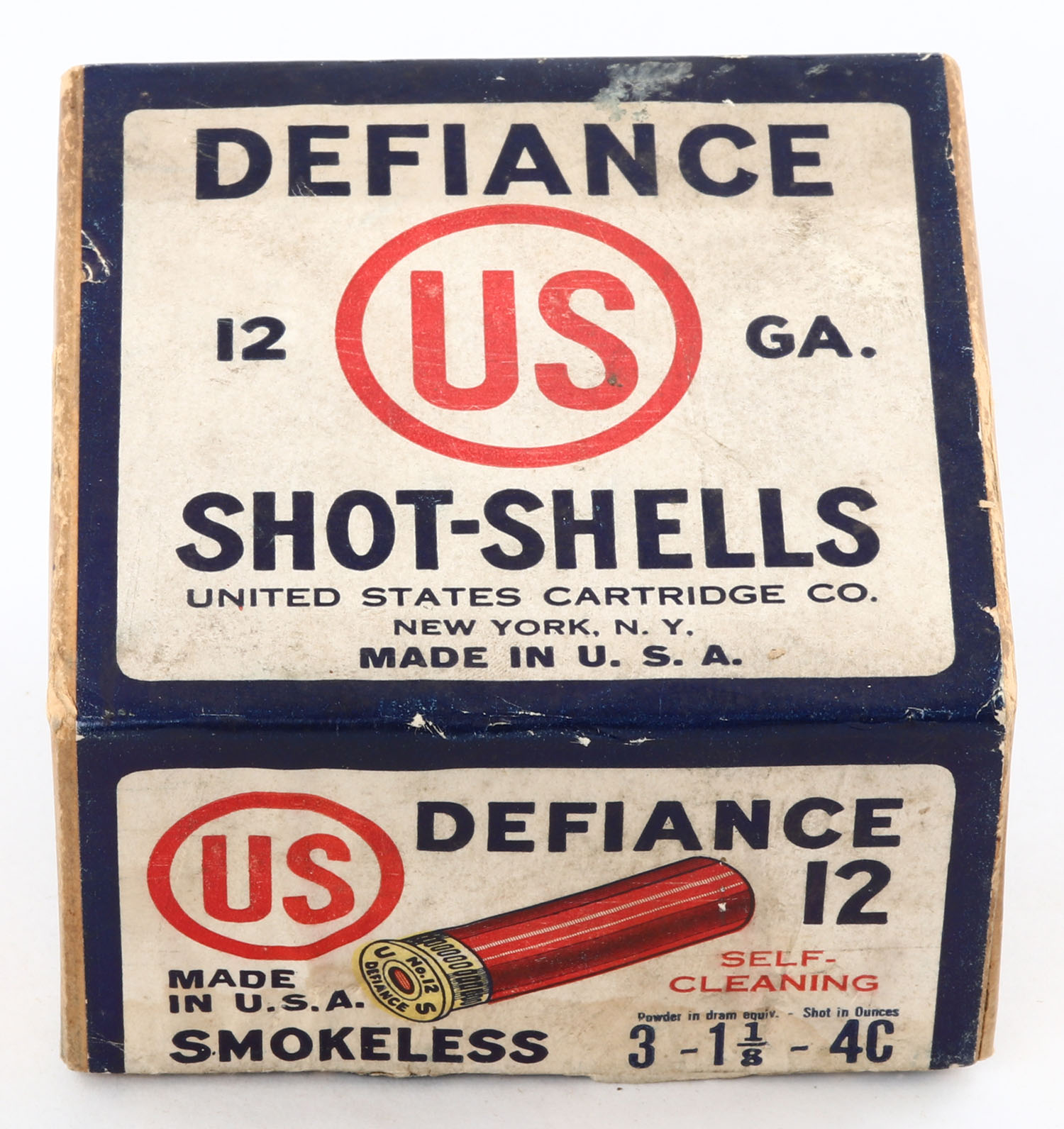 United States Cart., New York, N.Y., DEFIANCE, 12ga., 2pc., Empty, shot size 4C, buff box with white, red & blue label, box has light age soiling, light scuffing with very nice label. Grade: Very Good - Value: 20 to 60
