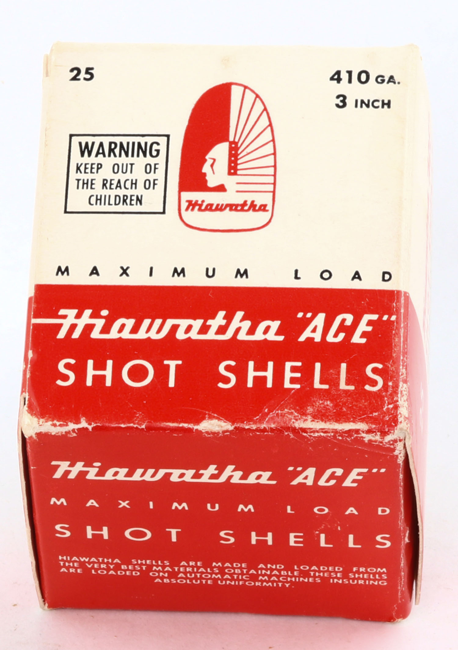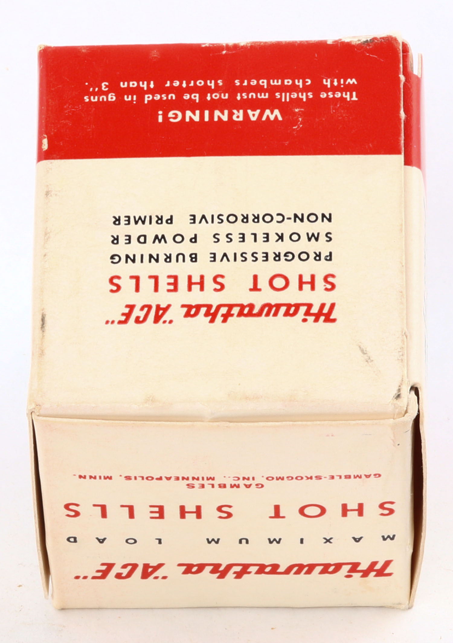 Gambles, Hiawatha ACE, 410ga., 1pc., Full, shot size 7 1/2, red, black & white box, box has a partial seam split with great color, plastic shells are excellent. Grade: Very Good ++ - Value: 26 to 100