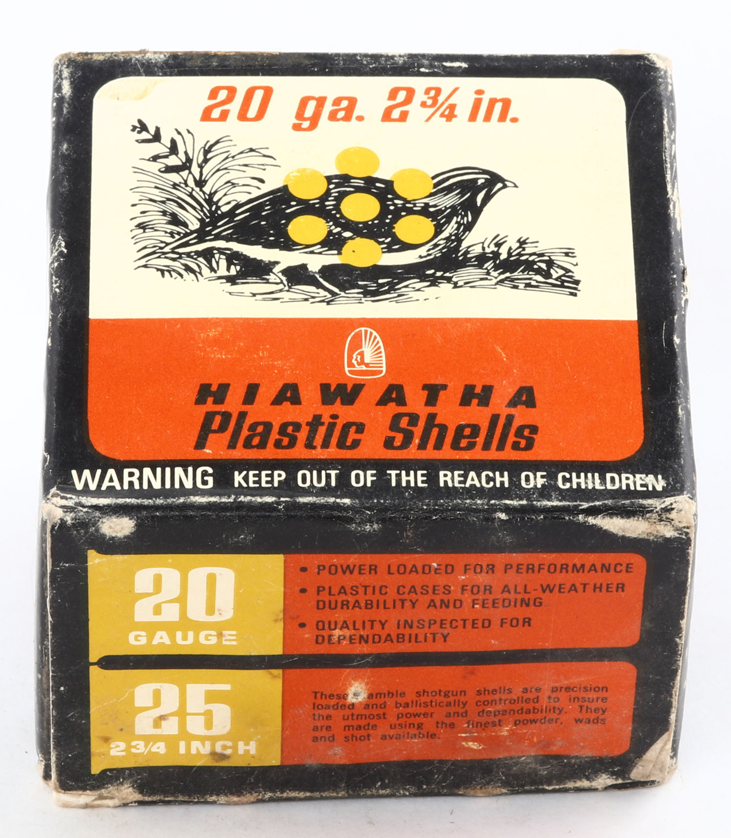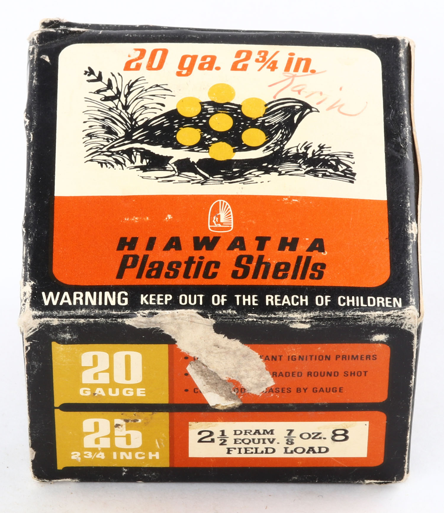 Gambles, Hiawatha, 20ga., 2 3/4'', 1pc., Full, shot size 8 Field Load, box is orange, gold, black & white, box has edge wear with nice colors, plastic shells are very good. Grade: Very Good - Value: 20 to 50
