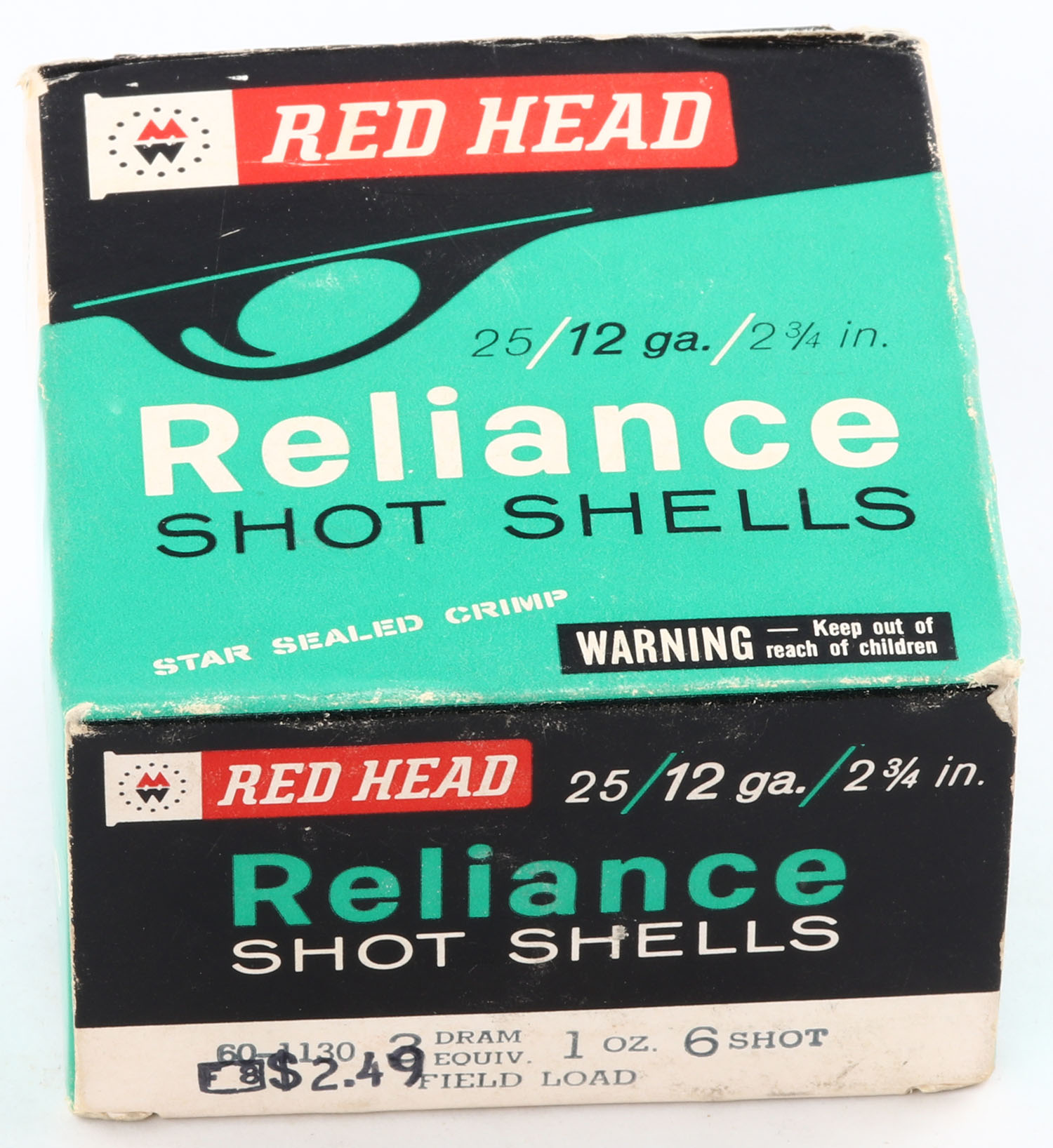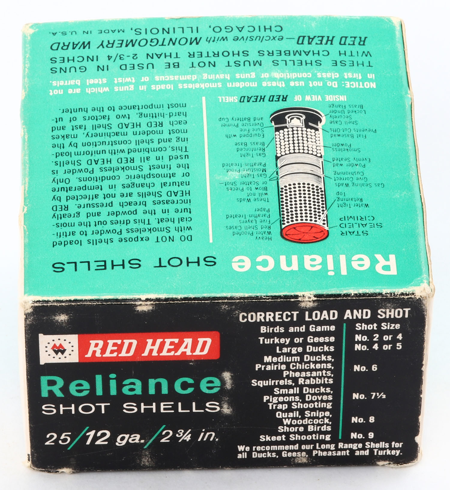 Montgomery Ward, Red Head Reliance Shot Shells, 12ga., 2 3/4'', 1pc., Full, shot size 6, box has some edge wear with nice colors, paper shells are excellent. Grade: Very Good ++ - Value: 10 to 30