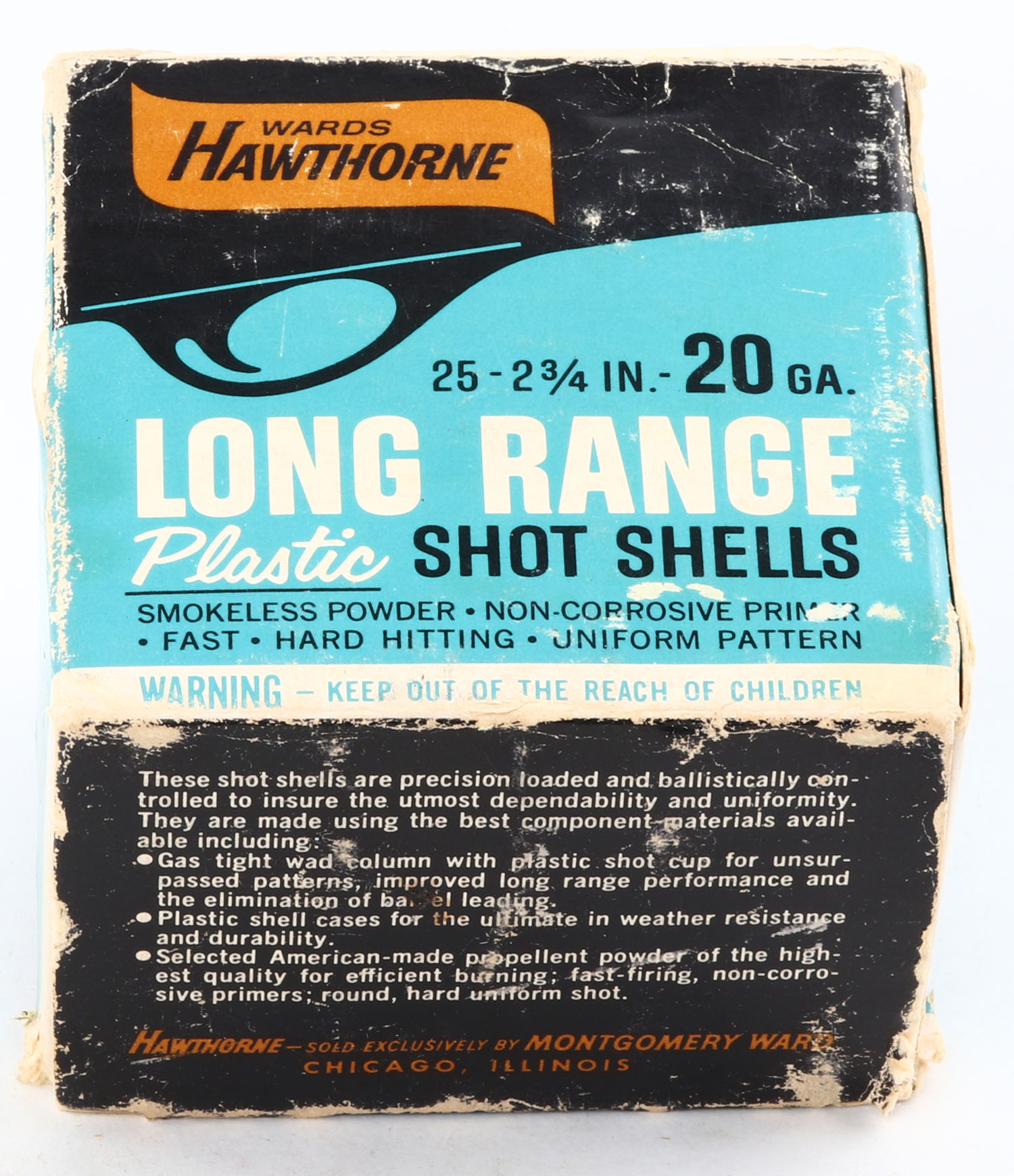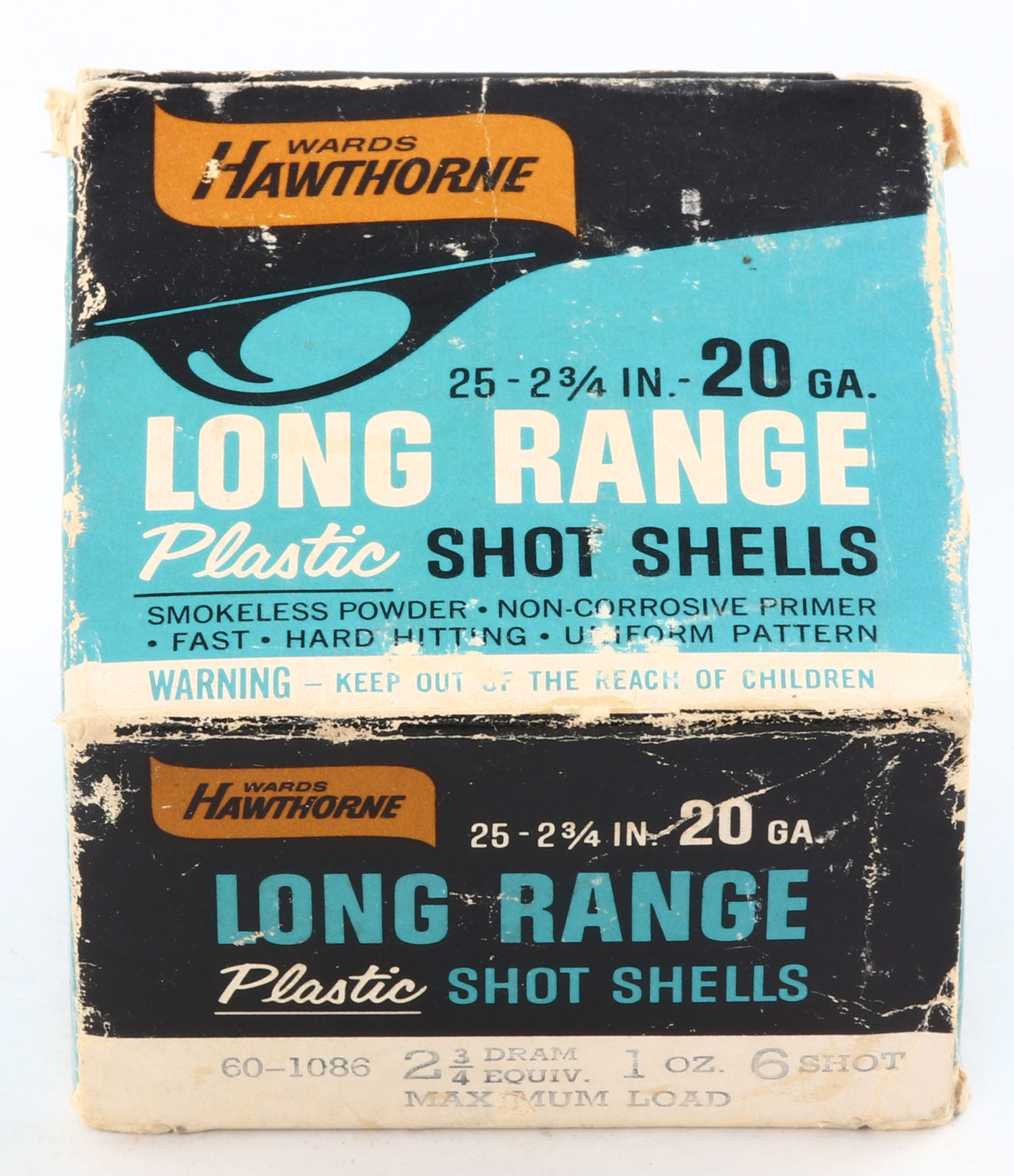 Wards Hawthorne, Long Range Shot Shells, 20 ga., 2 3/4'', 1pc., Full, shot size 6, box has edge wear, plastic shells are very good. Grade: Very Good - Value: 10 to 30