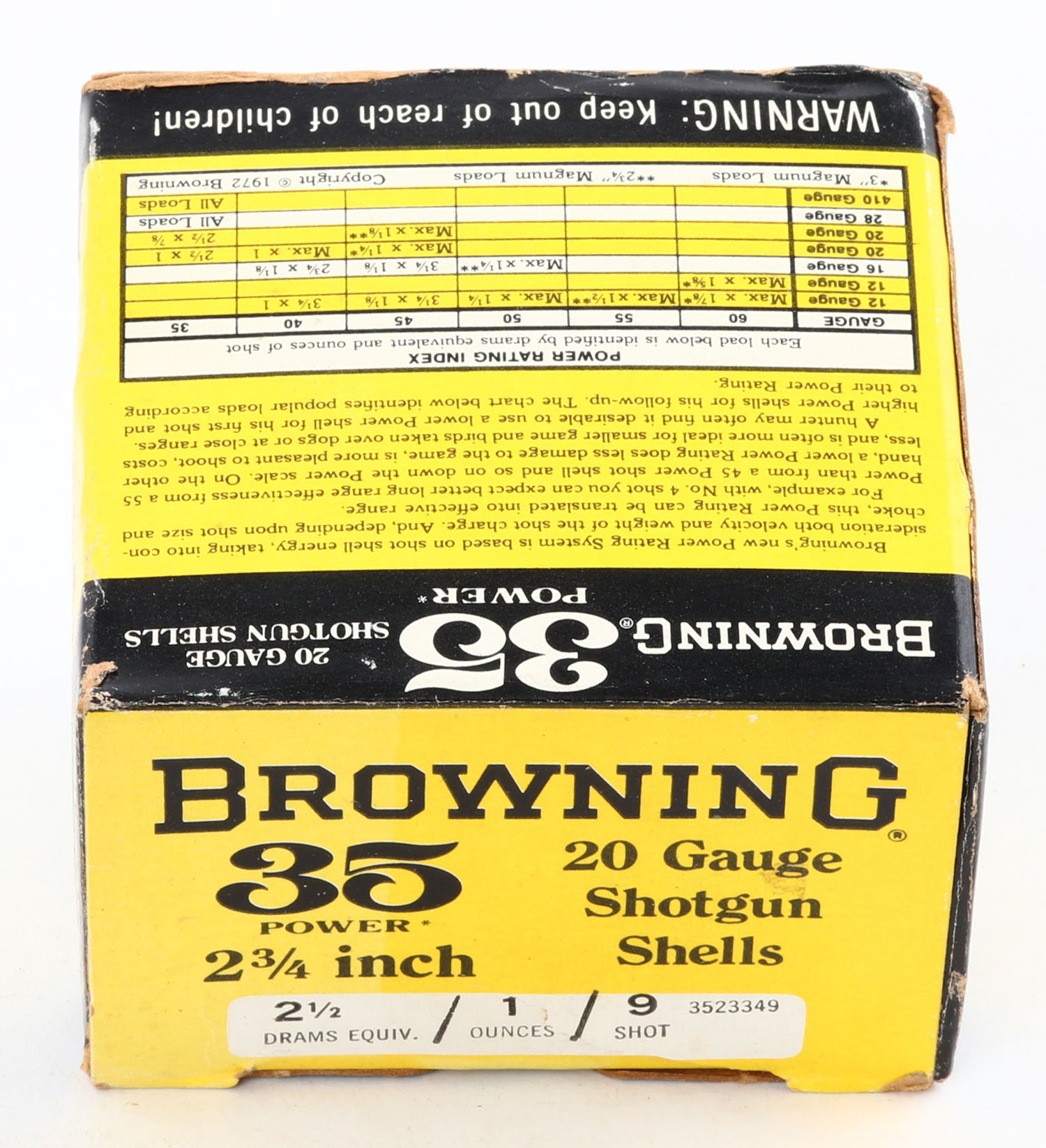 Browning, 35 Power, 20ga., 2 3/4'', 1pc., Full, shot size 9, black, yellow & white box, box is very solid with great color, has a partial tear to top flap, paper shells are excellent. Grade: Excellent - Value: 20 to 60