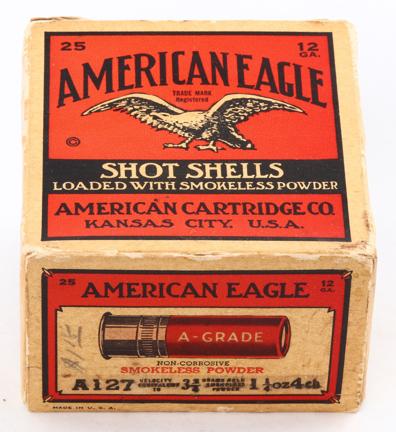 American Cart. Co., A-Grade, 12ga., 1pc., Full, shot size 4ch, buff, red & black box that pictures a flying eagle, box has edge & corner wear with great colors, paper shells are excellent. Grade: Excellent - Value: 40 to 100