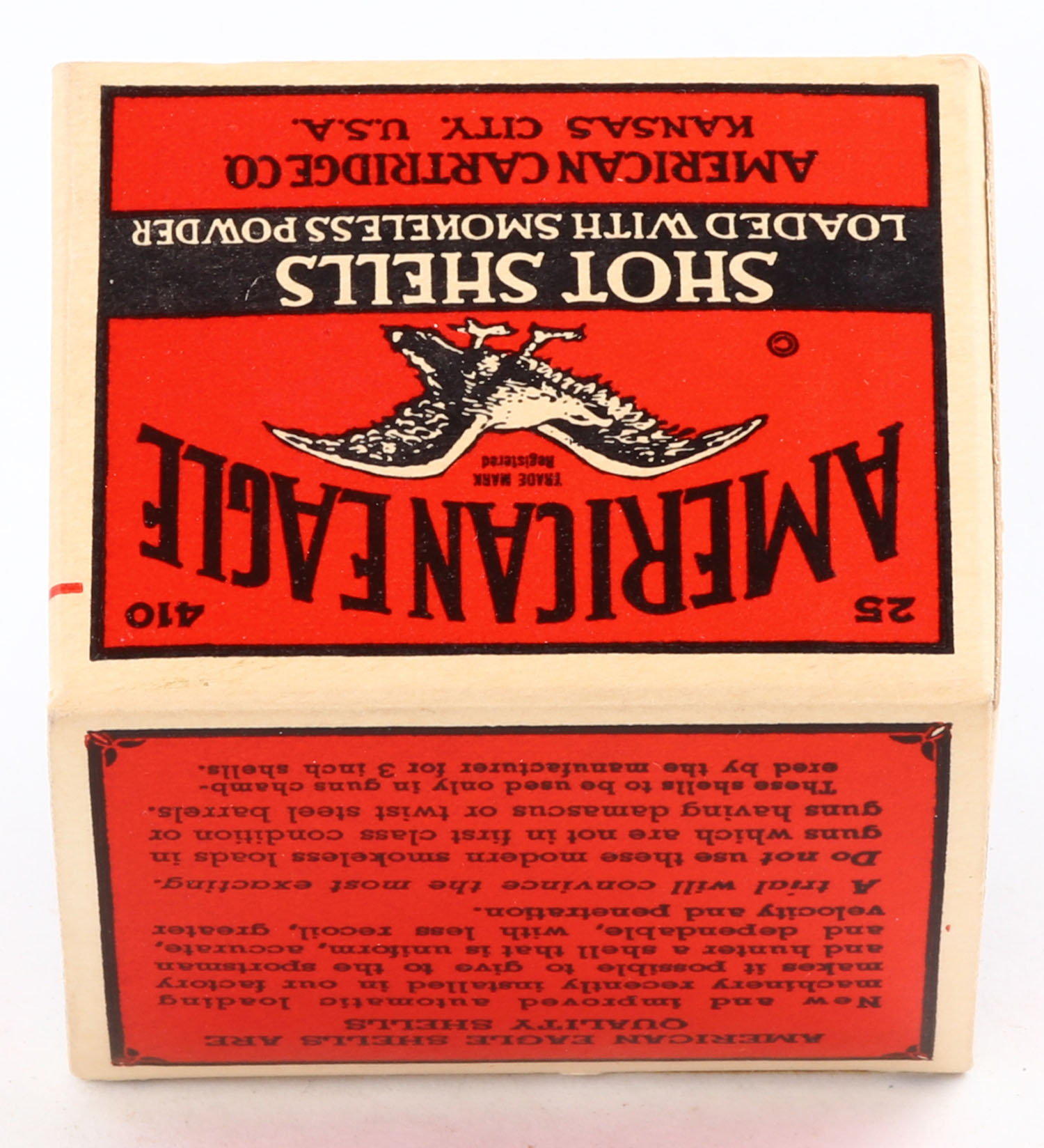 American Cart., Co., ''A'' Grade, 410ga., 1pc., Empty, buff, red & black box that pictures a flying eagle, box is very solid with excellent colors. Grade: MINT - Value: 40 to 200
